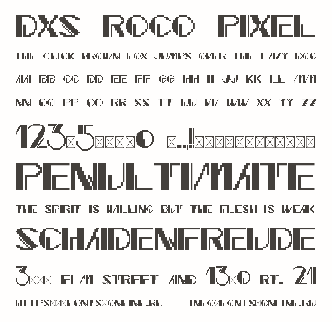 Шрифт DXS Roco Pixel. Гарнитура содержит 1 файл и поддерживает 15 языков. Лицензия CC BY-SA 3.0. Можно использовать в коммерческой и не коммерческой деятельности.