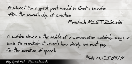 Шрифт Easy Speech. Гарнитура содержит 2 файла и поддерживает 41 язык. Разработка Easy Speech велась Jean-Jacques Morello.