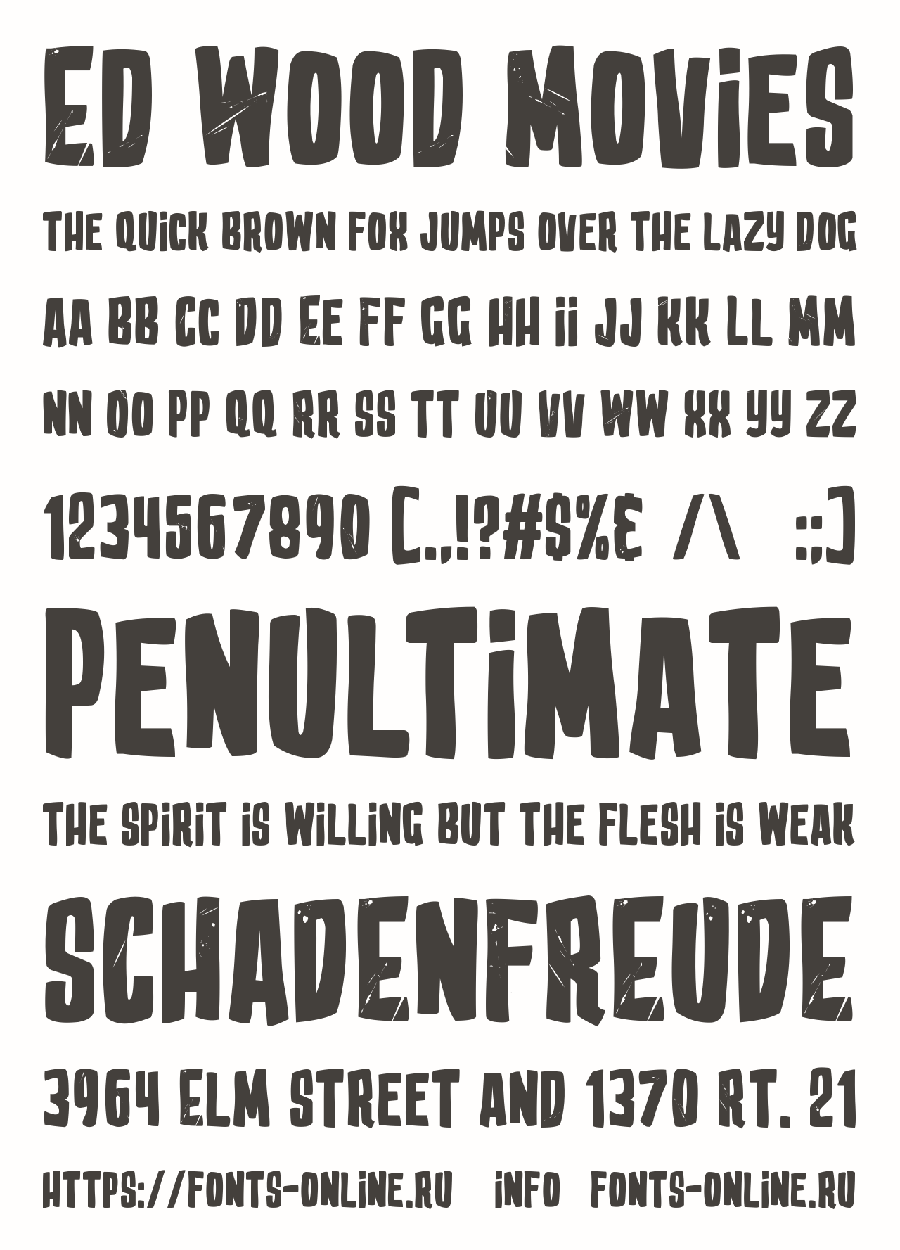 Шрифт Ed Wood Movies. Гарнитура содержит 1 файл и поддерживает 37 языков. Можно использовать в не коммерческой деятельности. Разработка Ed Wood Movies велась imagex.