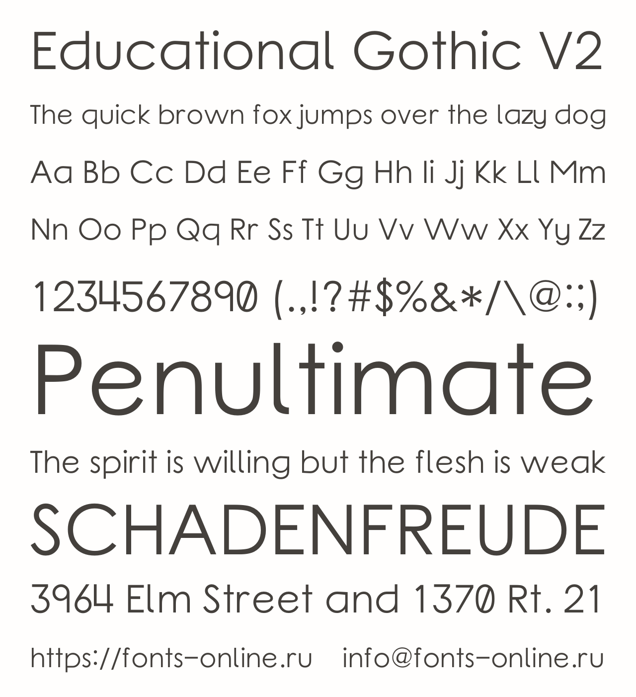 Шрифт Educational Gothic V2. Гарнитура содержит 1 файл и поддерживает 66 языков. Лицензия GNU GPL 3.0. Можно использовать в коммерческой и не коммерческой деятельности.