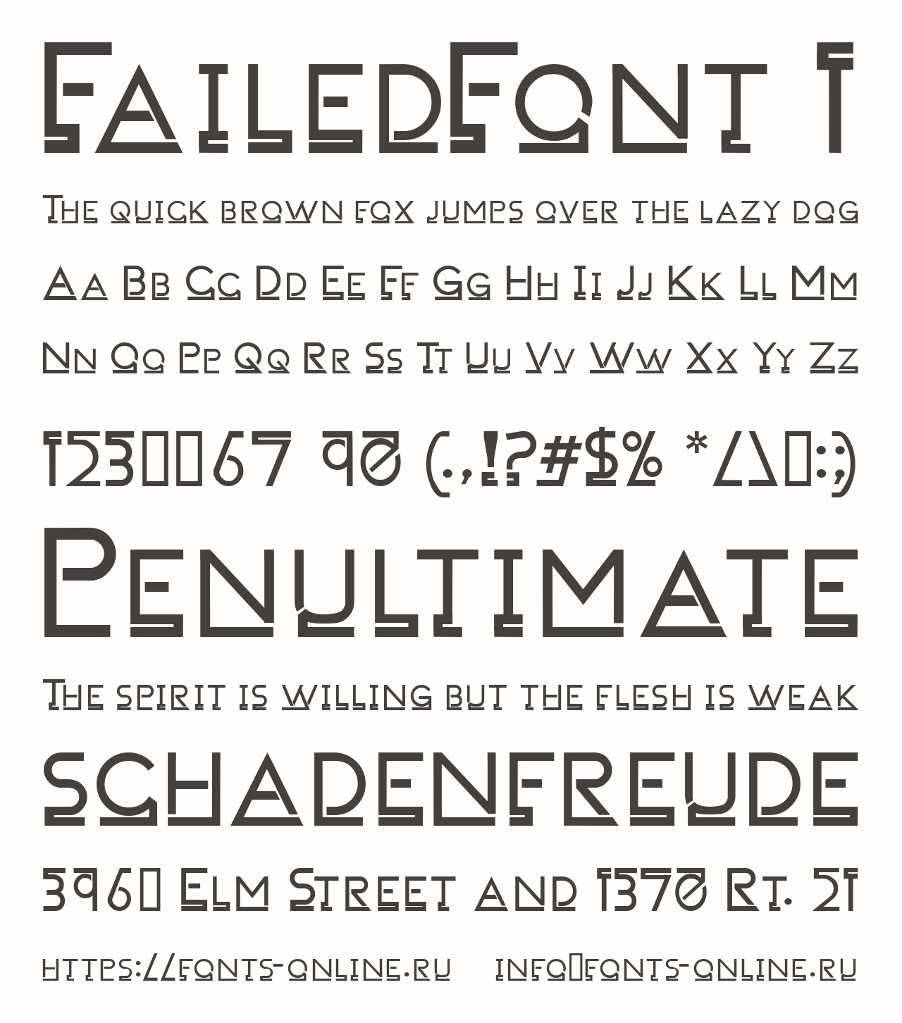Шрифт FailedFont 1. Гарнитура содержит 1 файл и поддерживает 12 языков. Можно использовать в коммерческой и не коммерческой деятельности.
