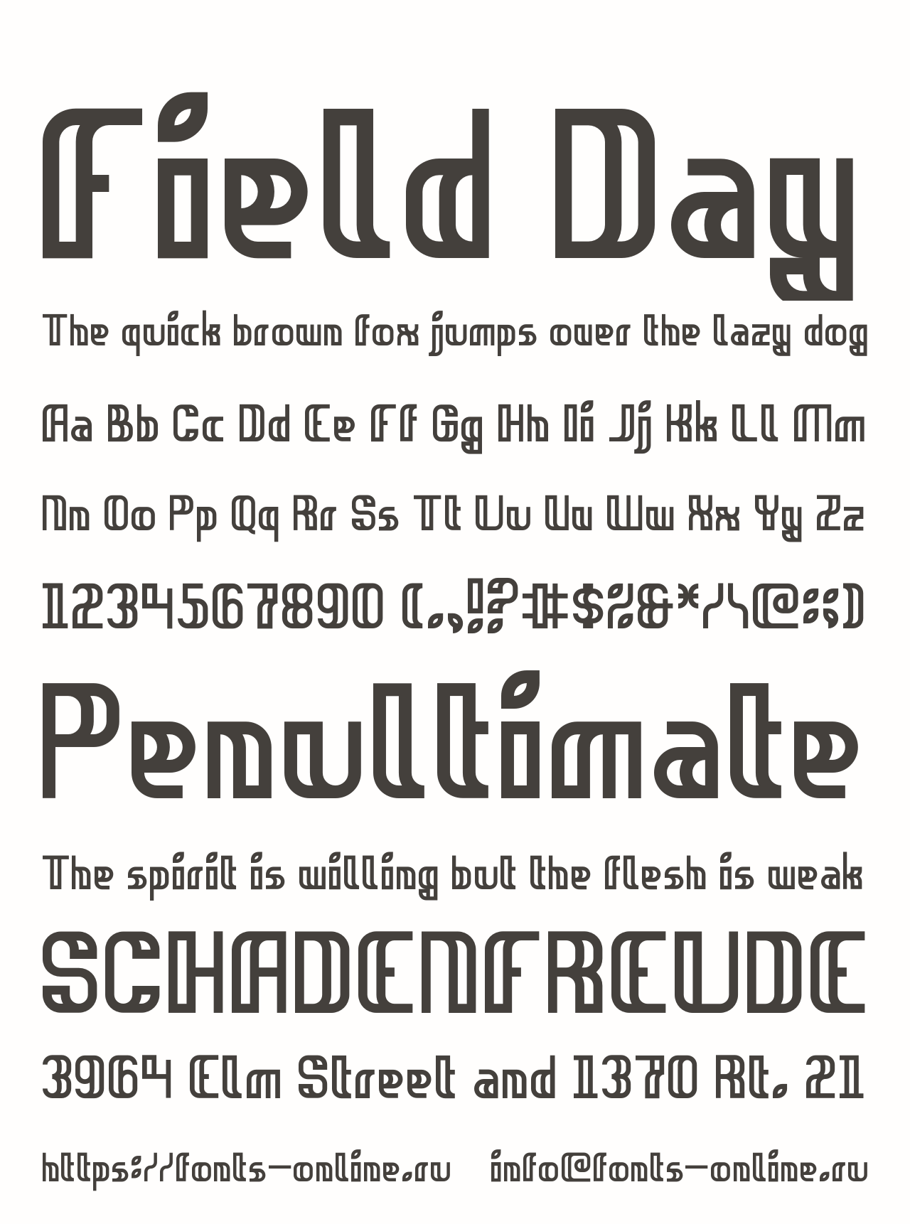 Шрифт Field Day. Гарнитура содержит 1 файл и поддерживает 12 языков. Можно использовать в не коммерческой деятельности. Разработка Field Day велась font studio four.