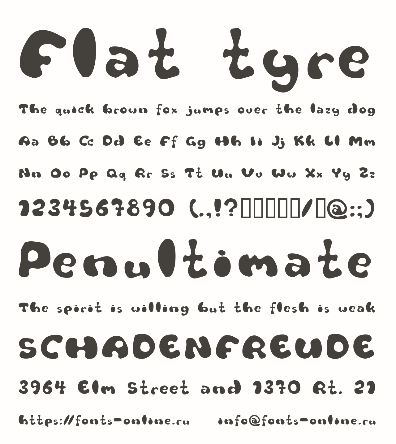 Шрифт Flat tyre. Гарнитура содержит 1 файл и поддерживает 12 языков. Можно использовать в коммерческой и не коммерческой деятельности.