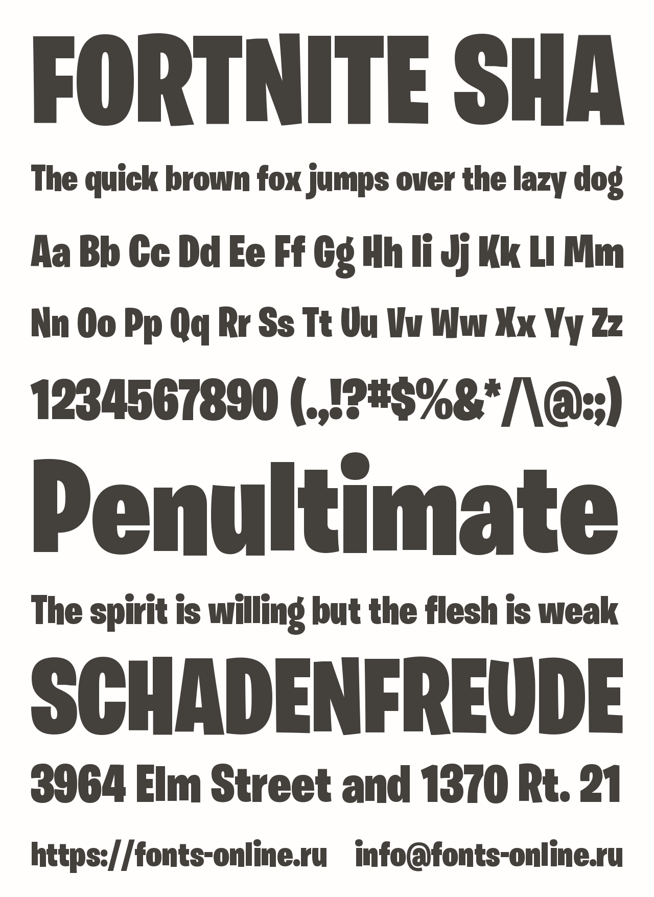 FORTNITE SHA PinterestFacebookTwitter Скачать FORTNITE SHA Тестировать FORTNITE SHA Сообщить об ошибке Шрифт FORTNITE SHA. Гарнитура содержит 1 файл и поддерживает 58 языков. Изображения Copyright Copyright (c) SpideRaYsfoNtS. All rights reserved. Дополнительная информация Категории Брендовые шрифты Тематические шрифты Шрифты из игр Шрифты без засечек Шрифты для заголовков Языки Албанский Английский Африкаанс Баскский Белорусский Болгарский Боснийский Бретонский Букмол Венгерский Волапюк Галисийский Датский Зулу Индонезийский Ирландский Исландский Испанский Итальянский Каталанский Кечуанский Корнский Латышский Литовский Люксембургский Малагасийский Мэнский Немецкий Нидерландский Новонорвежский Оромо Польский Португальский Романшский Руанда Румынский Рунди Русский Санго Северный ндебеле Сербский Словацкий Словенский Сомалийский Суахили Турецкий Узбекский Фарерский Финский Французский Хорватский Чеченский Чешский Шведский Шона Шотландский Эсперанто Эстонский