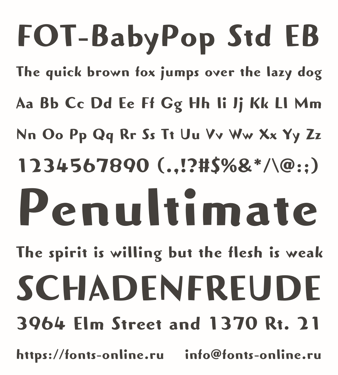FOT-BabyPop Std EB PinterestFacebookTwitter Скачать FOT-BabyPop Std EB Тестировать FOT-BabyPop Std EB Сообщить об ошибке Шрифт FOT-BabyPop Std EB. Гарнитура содержит 1 файл и поддерживает 44 языка. Copyright Copyright © 2014 Fontworks Inc. All Rights Reserved. Дополнительная информация Категории Комические шрифты Тематические шрифты Шрифты без засечек Шрифты для заголовков Шрифты для текста Языки Албанский Английский Африкаанс Баскский Болгарский Бретонский Букмол Волапюк Галисийский Датский Зулу Индонезийский Ирландский Исландский Испанский Итальянский Каталанский Кечуанский Корнский Люксембургский Малагасийский Мэнский Немецкий Нидерландский Новонорвежский Оромо Португальский Романшский Руанда Рунди Русский Санго Северный ндебеле Сомалийский Суахили Узбекский Фарерский Финский Французский Чеченский Шведский Шона Шотландский Эстонский