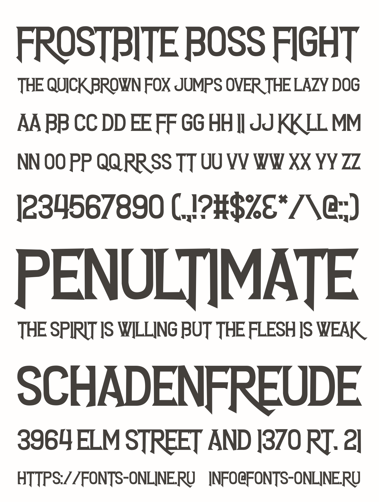 Шрифт Frostbite Boss Fight. Гарнитура содержит 1 файл и поддерживает 12 языков. Можно использовать в не коммерческой деятельности. Разработка Frostbite Boss Fight велась Chequered Ink.