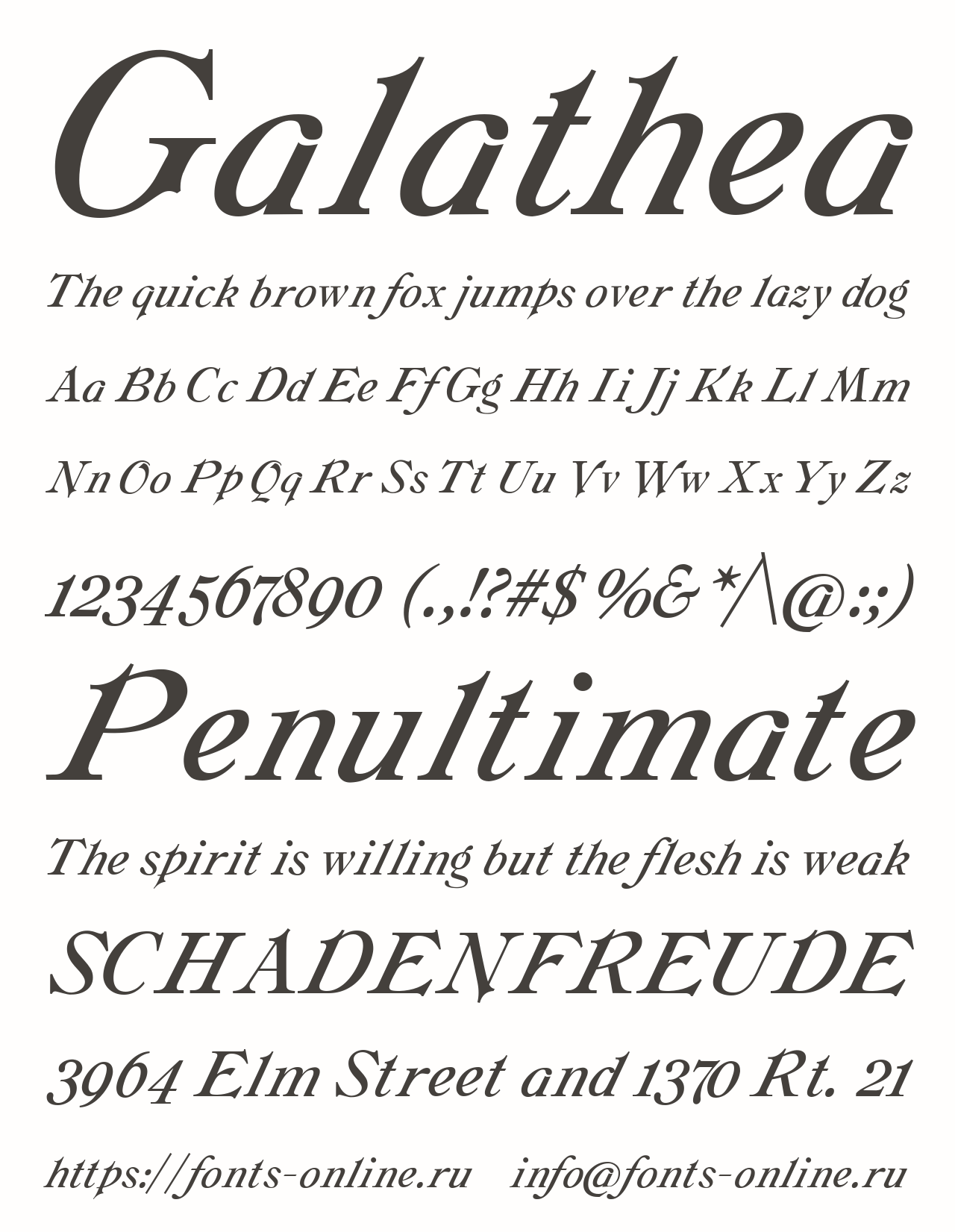 Шрифт Galathea. Гарнитура содержит 2 файла и поддерживает 71 язык. Можно использовать в не коммерческой деятельности. Разработка Galathea велась Alexandra Gophmann.