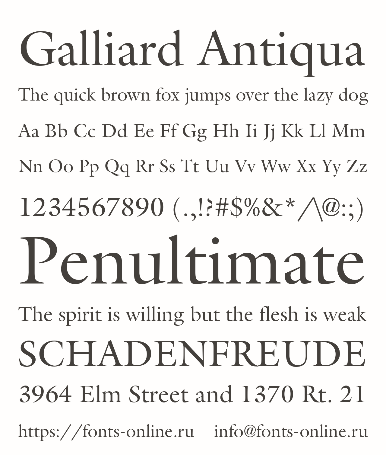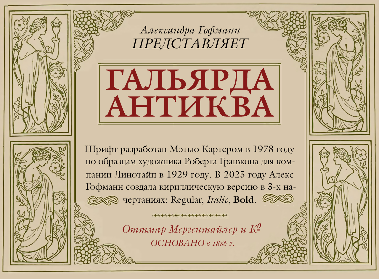 Шрифт Galliard Antiqua. Гарнитура содержит 3 файла и поддерживает 74 языка. Можно использовать в не коммерческой деятельности.