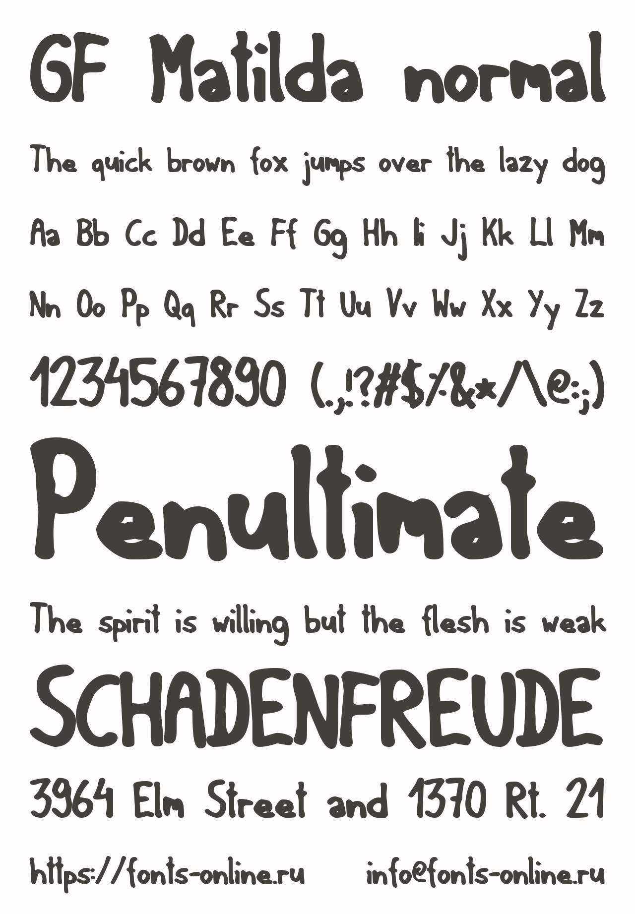 Шрифт GF Matilda normal. Гарнитура содержит 2 файла и поддерживает 13 языков. Можно использовать в не коммерческой деятельности. Разработка GF Matilda normal велась GF Fonts.