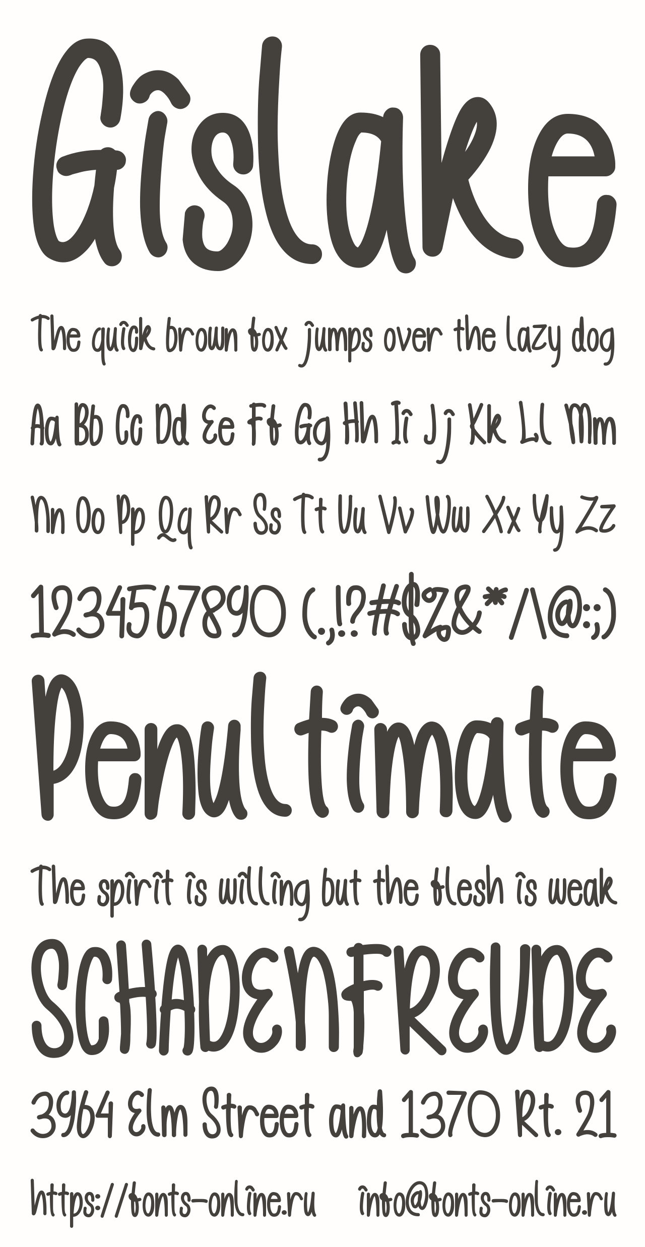 Шрифт Gislake. Гарнитура содержит 1 файл и поддерживает 12 языков. Можно использовать в не коммерческой деятельности. Разработка Gislake велась Hermawan.