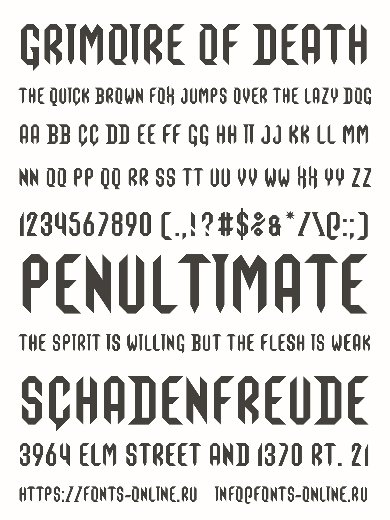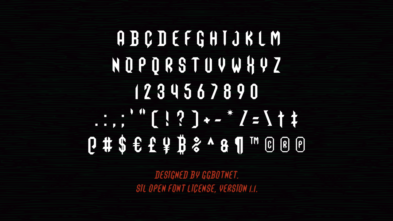 Шрифт Grimoire Of Death. Гарнитура содержит 2 файла и поддерживает 57 языков. Лицензия SIL OFL 1.1. Можно использовать в коммерческой и не коммерческой деятельности. Разработка Grimoire Of Death велась GGBotNet.