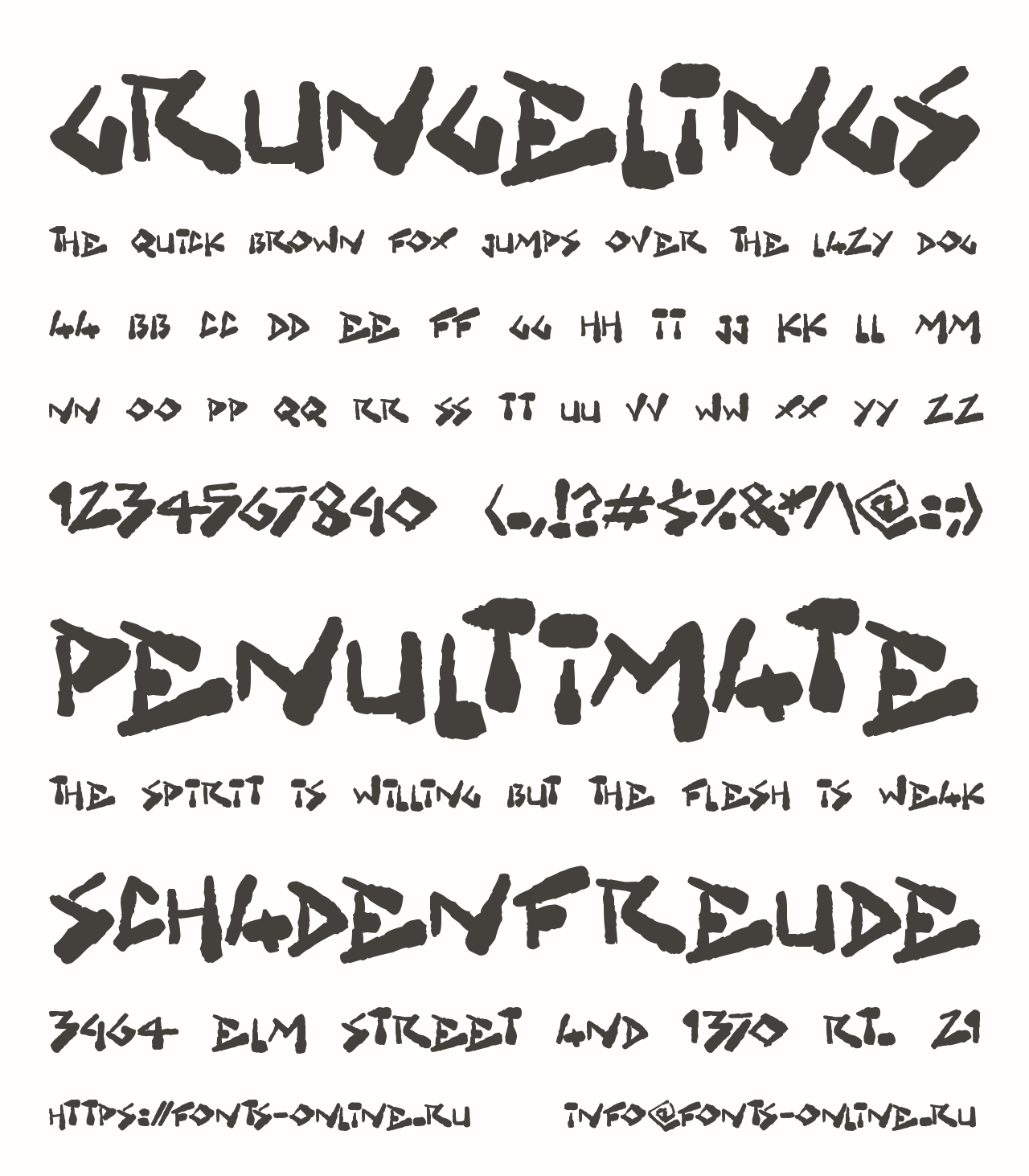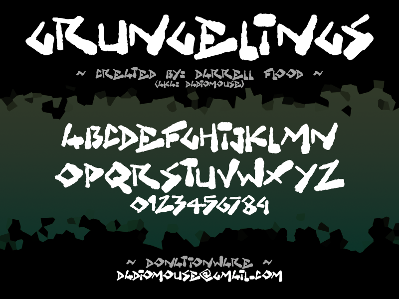 Шрифт Grungelings. Гарнитура содержит 1 файл и поддерживает 0 языков. Разработка Grungelings велась Darrell Flood.