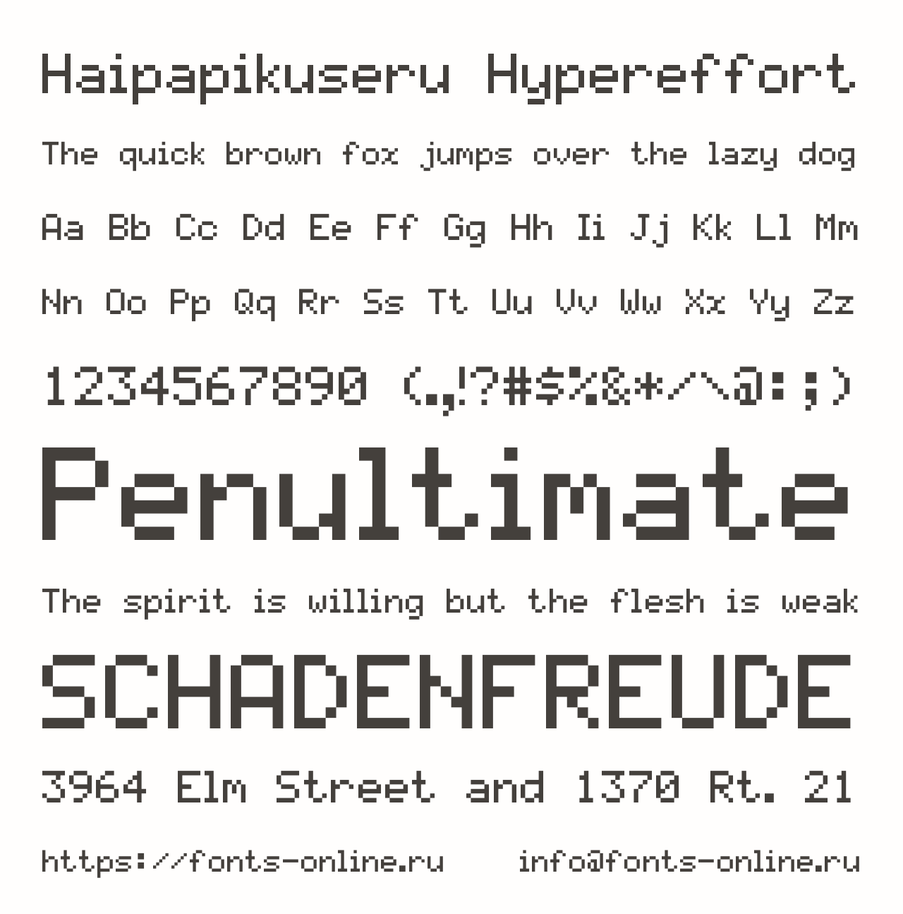 Шрифт Haipapikuseru Hypereffort. Гарнитура содержит 1 файл и поддерживает 82 языка. Лицензия GNU LGPL 3.0. Можно использовать в коммерческой и не коммерческой деятельности.