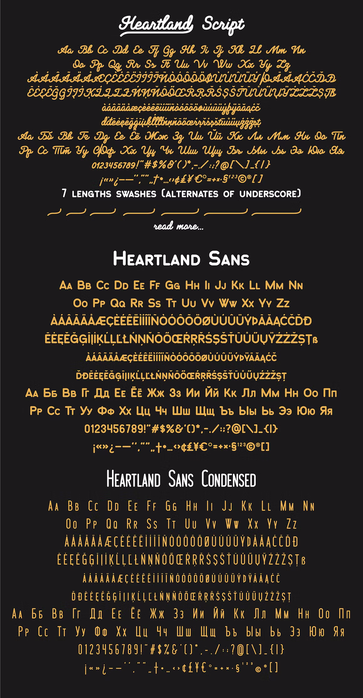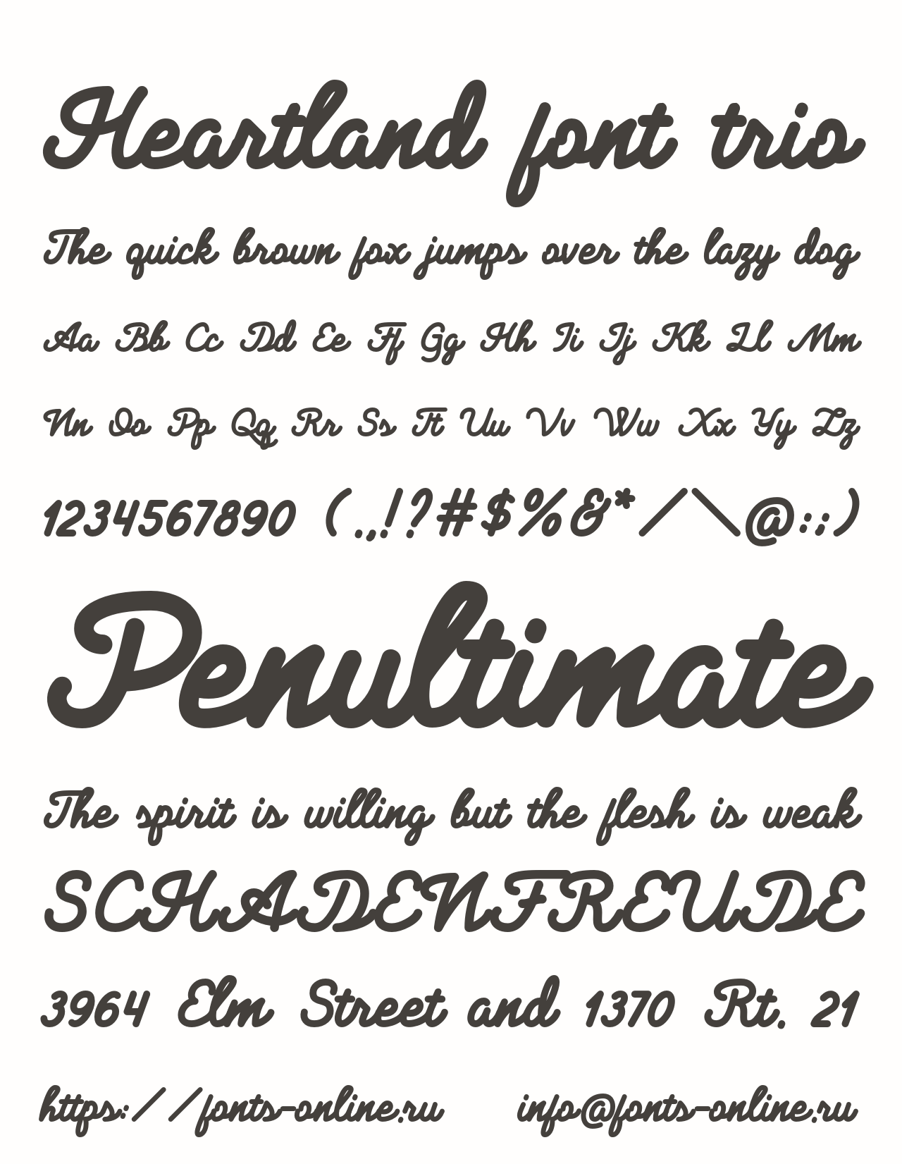 Шрифт Heartland font trio. Гарнитура содержит 3 файла и поддерживает 52 языка. Разработка Heartland font trio велась Nrey.