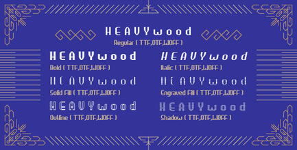 Шрифт HEAVYwood. Гарнитура содержит 14 файлов и поддерживает 34 языка. Можно использовать в не коммерческой деятельности. Разработка HEAVYwood велась Greentrik6789.