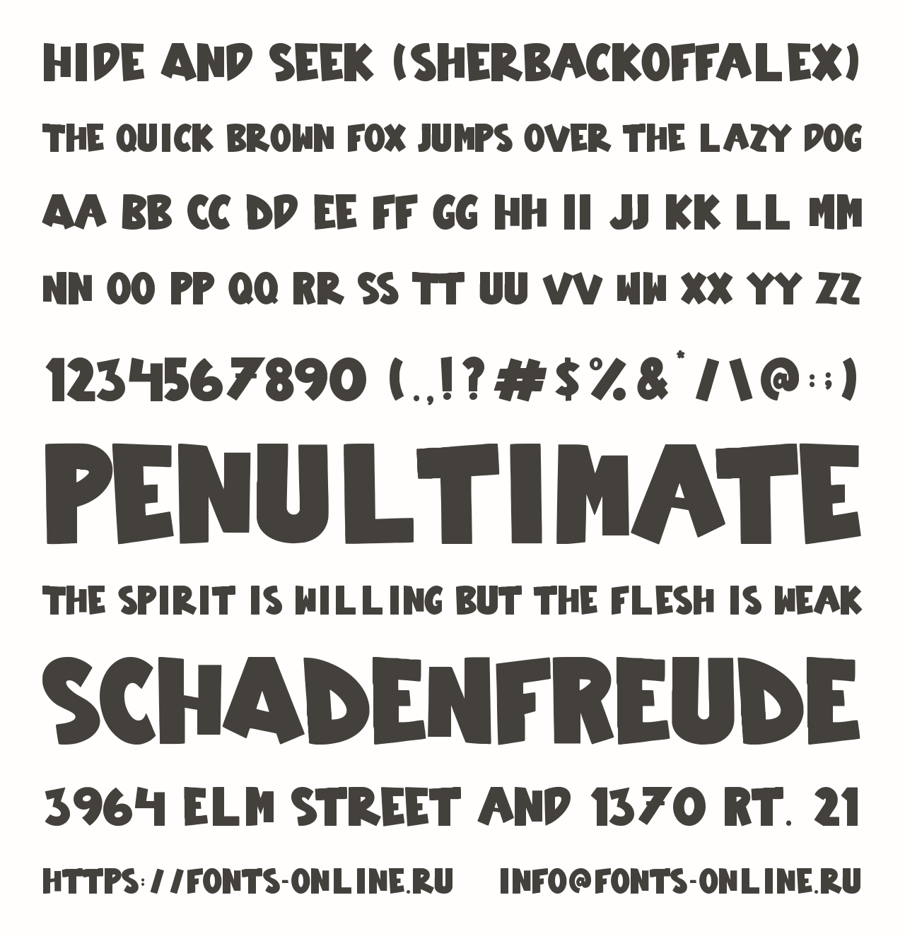 Hide And Seek (sherbackoffalex) PinterestFacebookTwitter Скачать Hide And Seek (sherbackoffalex) Тестировать Hide And Seek (sherbackoffalex) Сообщить об ошибке Шрифт Hide And Seek (sherbackoffalex). Гарнитура содержит 2 файла и поддерживает 15 языков. Изображения Copyright Copyright (c) 2021 by HATF .ALLrights reserved Дополнительная информация Категории Комические шрифты Тематические шрифты Шрифты без засечек Шрифты для заголовков Языки Английский Болгарский Зулу Индонезийский Корнский Оромо Руанда Рунди Русский Северный ндебеле Сомалийский Суахили Узбекский Чеченский Шона