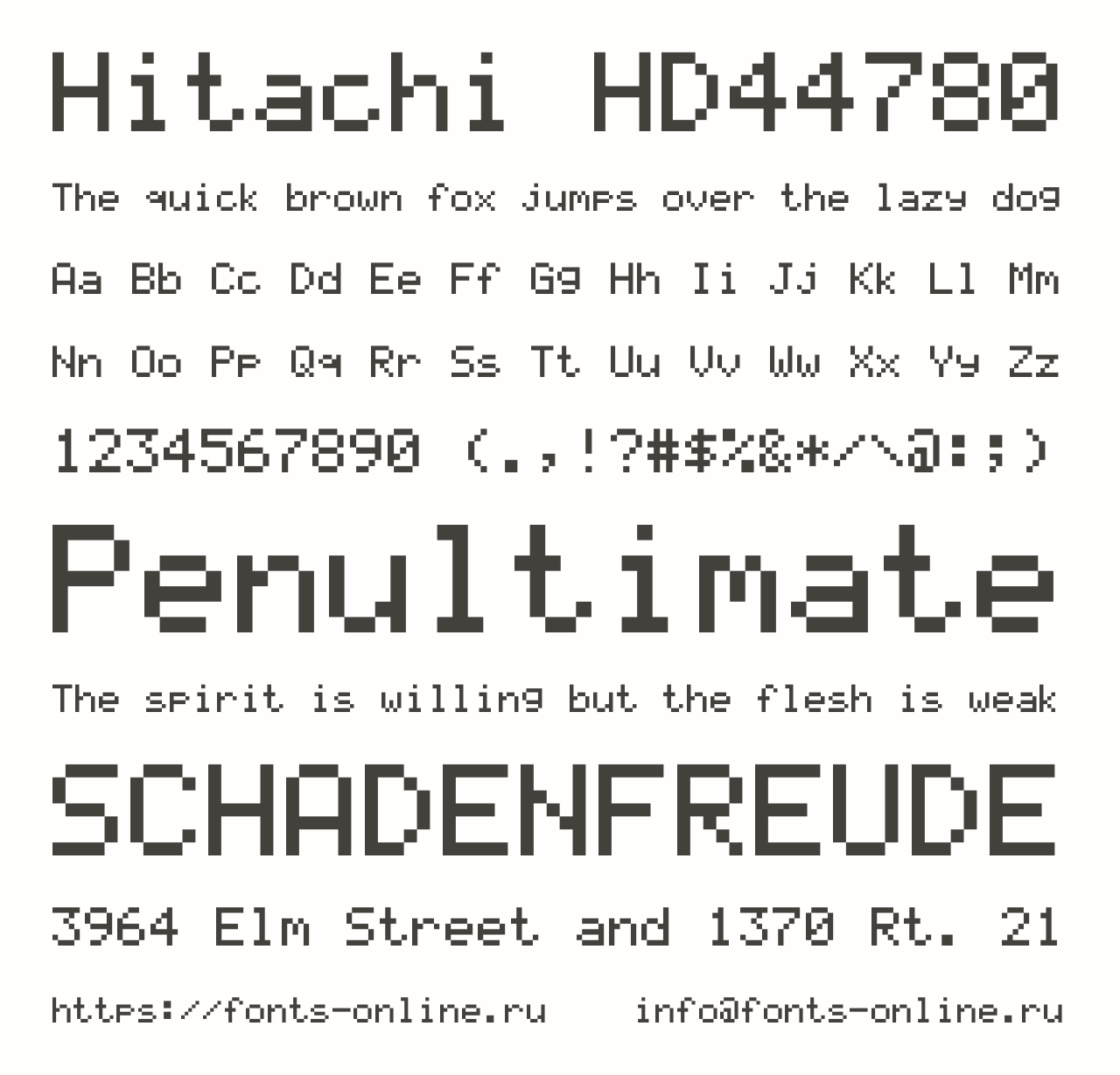 Шрифт Hitachi HD44780. Гарнитура содержит 1 файл и поддерживает 46 языков. Лицензия GNU LGPL 3.0. Можно использовать в коммерческой и не коммерческой деятельности.