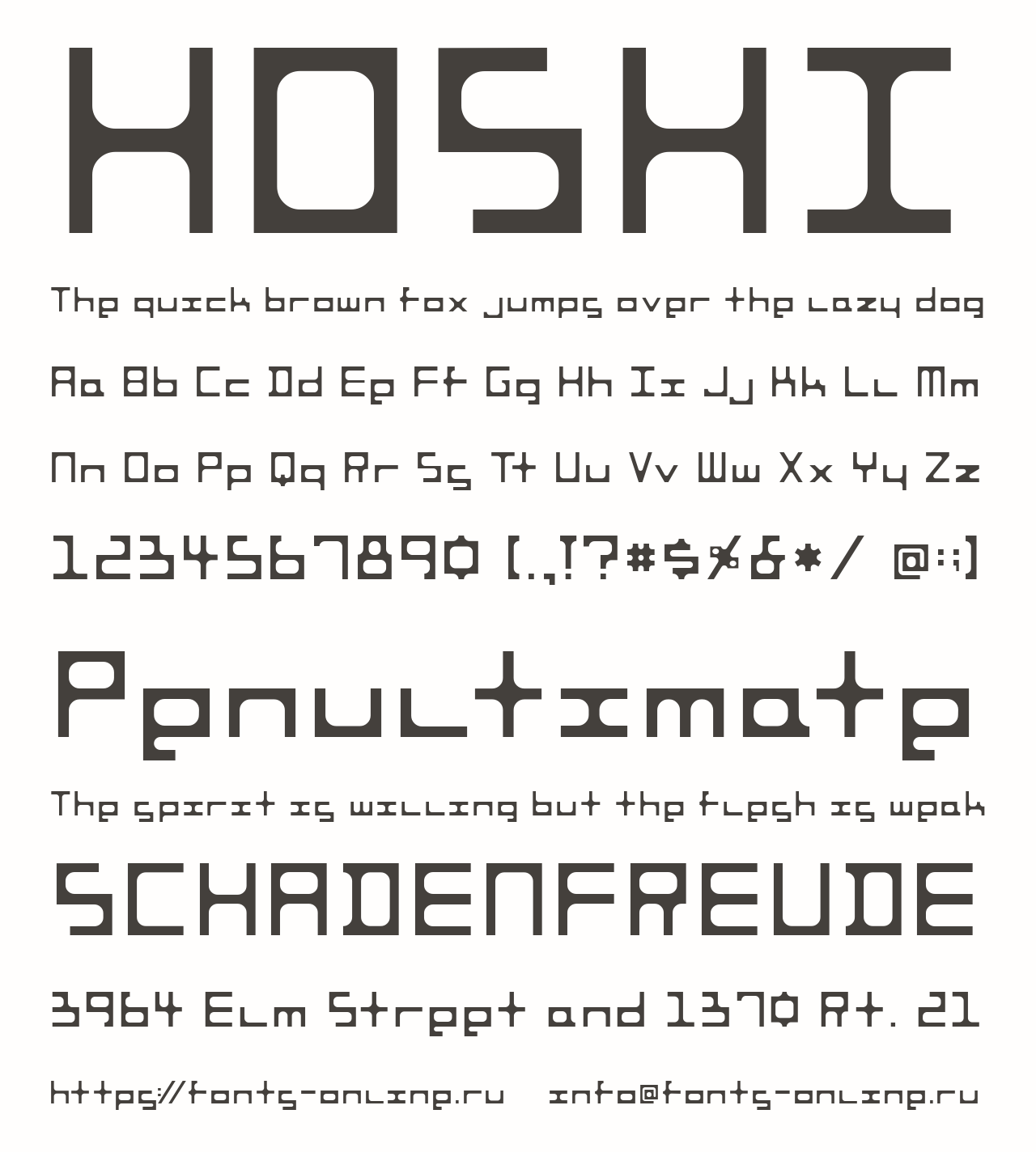 Шрифт HOSHI. Гарнитура содержит 2 файла и поддерживает 41 язык. Можно использовать в не коммерческой деятельности.