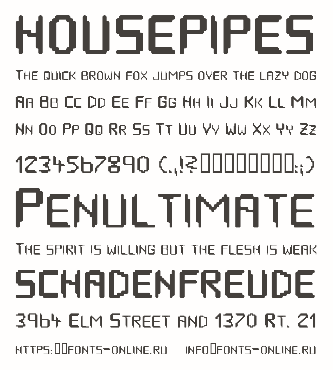 Шрифт HOUSEPIPES. Гарнитура содержит 2 файла и поддерживает 12 языков. Можно использовать в коммерческой и не коммерческой деятельности.