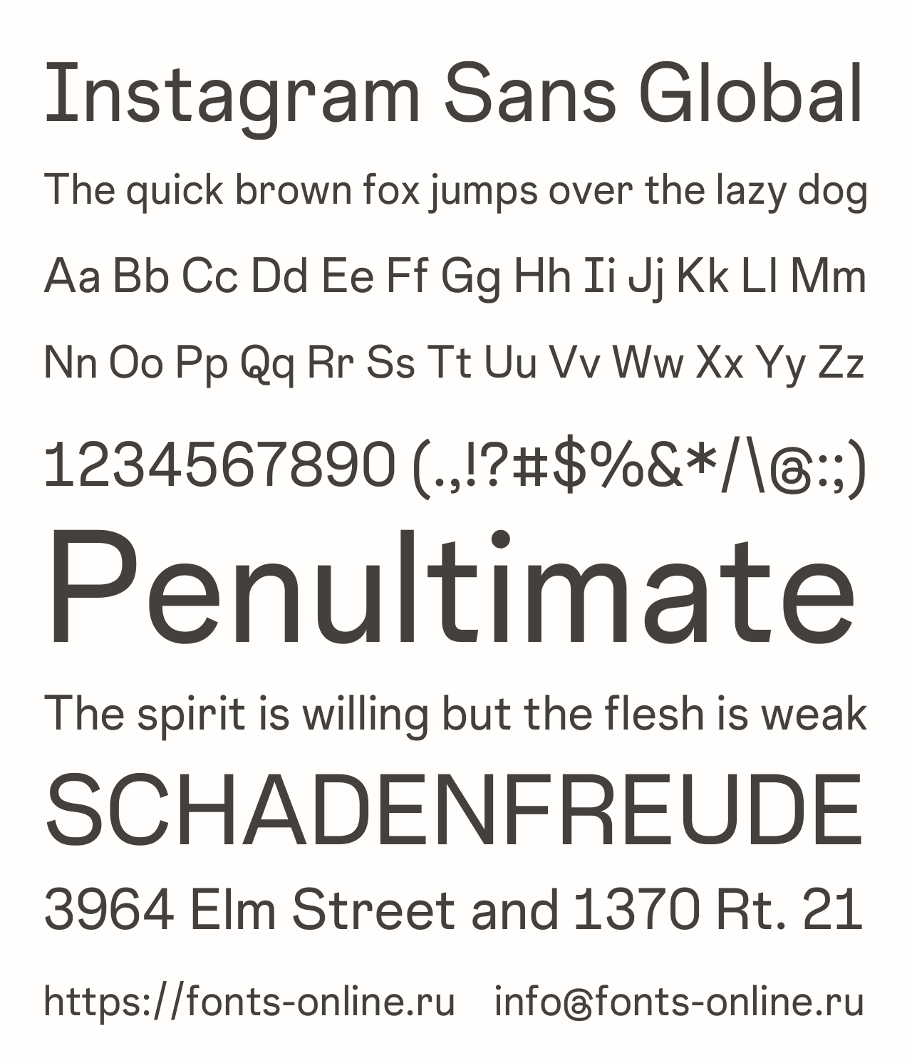 Instagram Sans Global PinterestFacebookTwitter Скачать Instagram Sans Global Тестировать Instagram Sans Global Сообщить об ошибке Шрифт Instagram Sans Global. Гарнитура содержит 17 файлов и поддерживает 63 языка. Copyright Copyright © 2021 by Colophon Foundry. All rights reserved. Дополнительная информация Категории Сondensed шрифты Современные шрифты Тематические шрифты Брендовые шрифты Шрифты без засечек Шрифты для заголовков Шрифты для текста Языки Албанский Английский Африкаанс Баскский Бретонский Букмол Валлийский Венгерский Волапюк Вьетнамский Галисийский Гренландский Датский Западнофризский Зулу Игбо Индонезийский Ирландский Исландский Испанский Итальянский Йоруба Каталанский Кечуанский Кикуйю Корнский Латышский Литовский Луганда Люксембургский Малагасийский Мальтийский Мэнский Немецкий Нидерландский Новонорвежский Оромо Польский Португальский Романшский Руанда Румынский Рунди Санго Северносаамский Северный ндебеле Словацкий Словенский Сомалийский Суахили Тонганский Турецкий Узбекский Фарерский Финский Французский Хорватский Чешский Шведский Шона Шотландский Эсперанто Эстонский