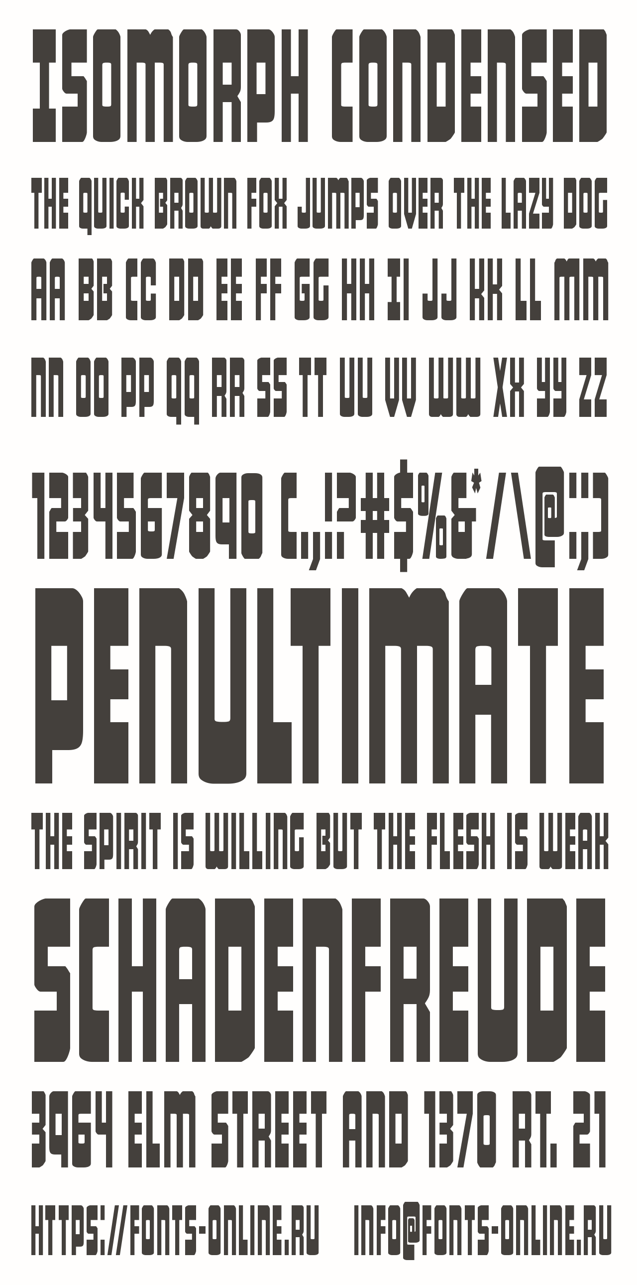 Шрифт Isomorph Condensed. Гарнитура содержит 24 файла и поддерживает 41 язык. Разработка Isomorph Condensed велась Iconian Fonts.