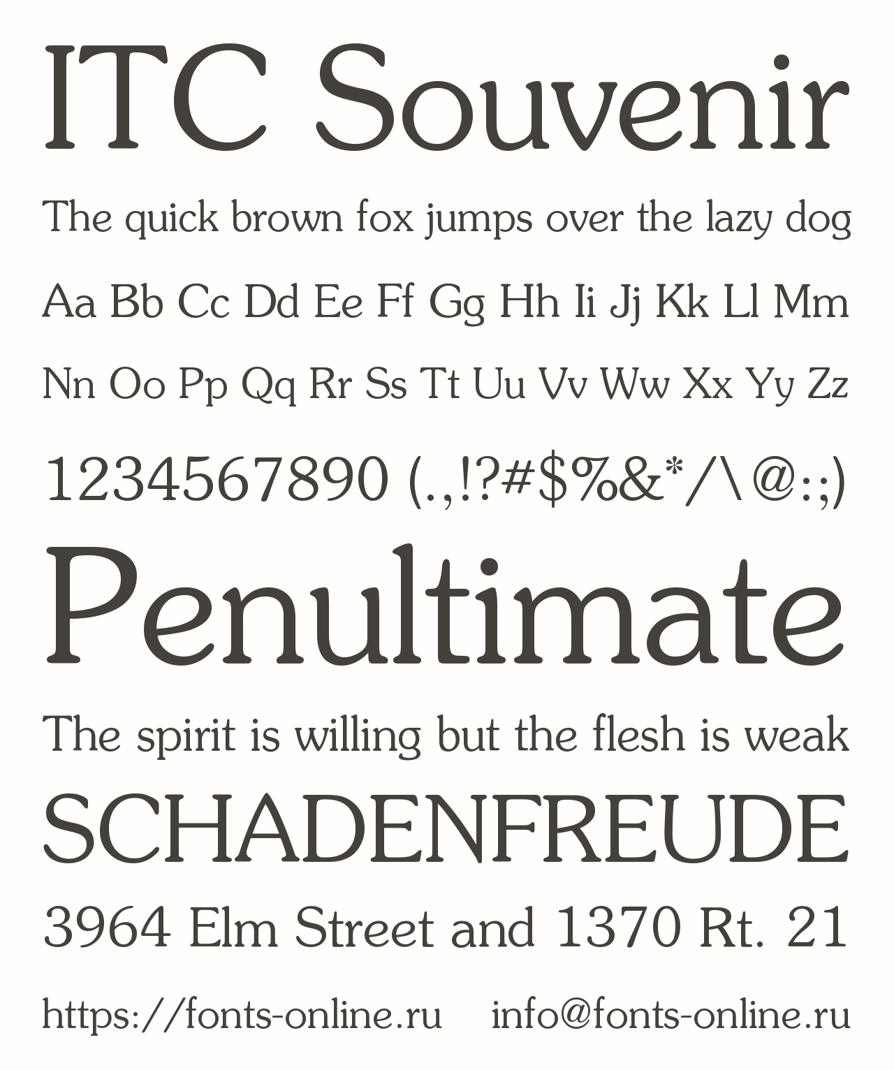 ITC Souvenir PinterestFacebookTwitter Скачать ITC Souvenir Тестировать ITC Souvenir Сообщить об ошибке Шрифт ITC Souvenir. Гарнитура содержит 8 файлов и поддерживает 41 язык. Описание If you use this font, you can! Copyright Copyright (c) 2002, Adobe Systems Inc. Дополнительная информация Категории Шрифты для текста Шрифты с засечками Языки Албанский Английский Африкаанс Баскский Бретонский Букмол Волапюк Галисийский Датский Зулу Индонезийский Ирландский Исландский Испанский Итальянский Каталанский Кечуанский Корнский Люксембургский Малагасийский Мэнский Немецкий Нидерландский Новонорвежский Оромо Португальский Романшский Руанда Рунди Санго Северный ндебеле Сомалийский Суахили Узбекский Фарерский Финский Французский Шведский Шона Шотландский Эстонский