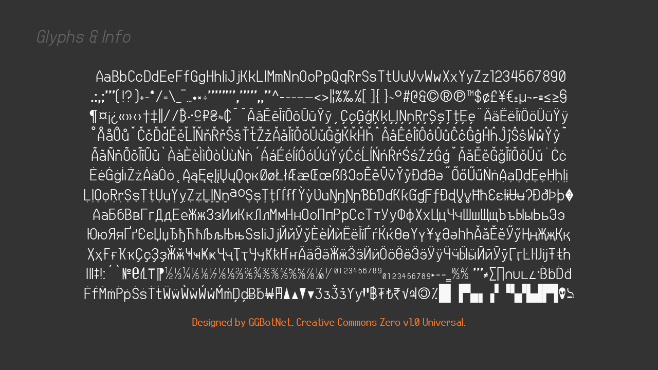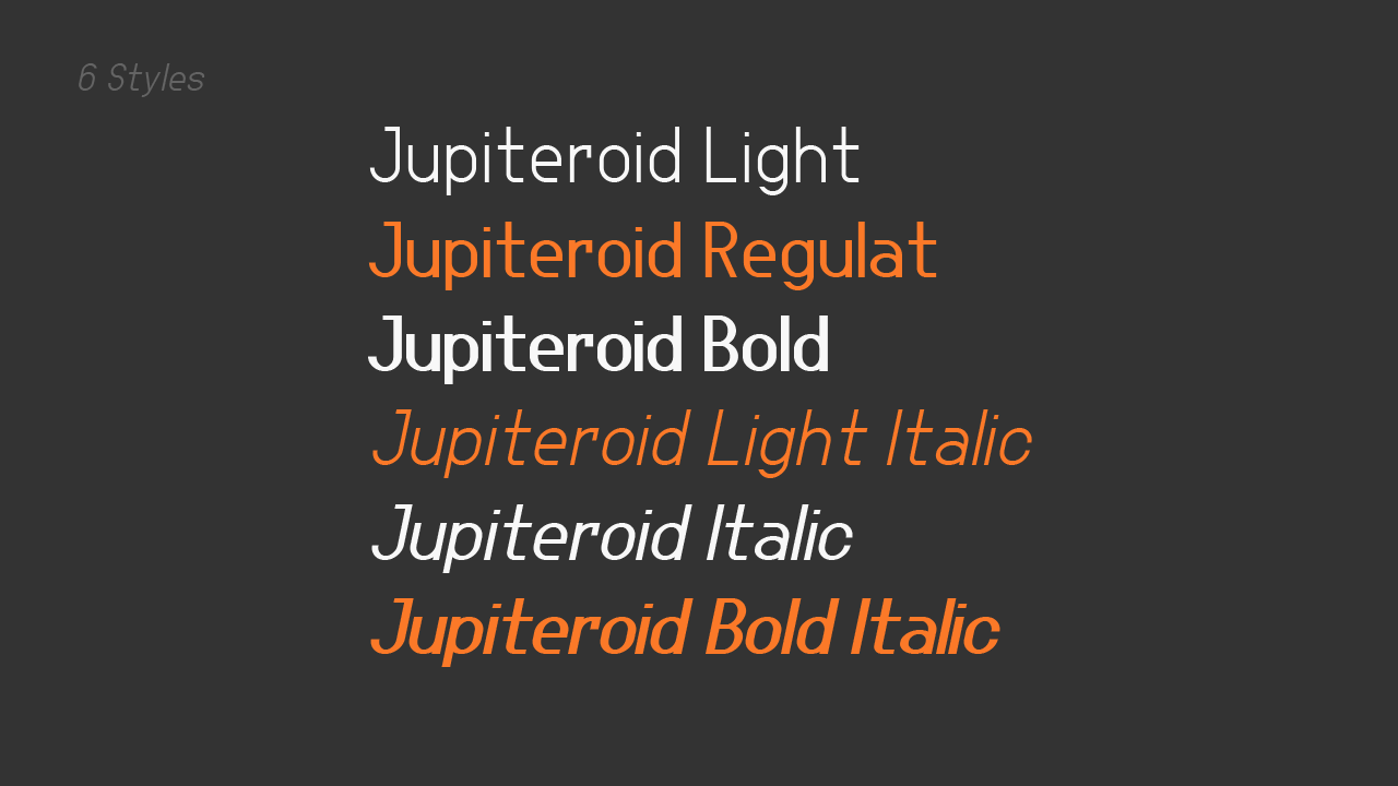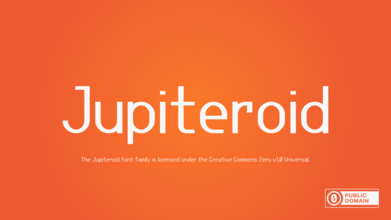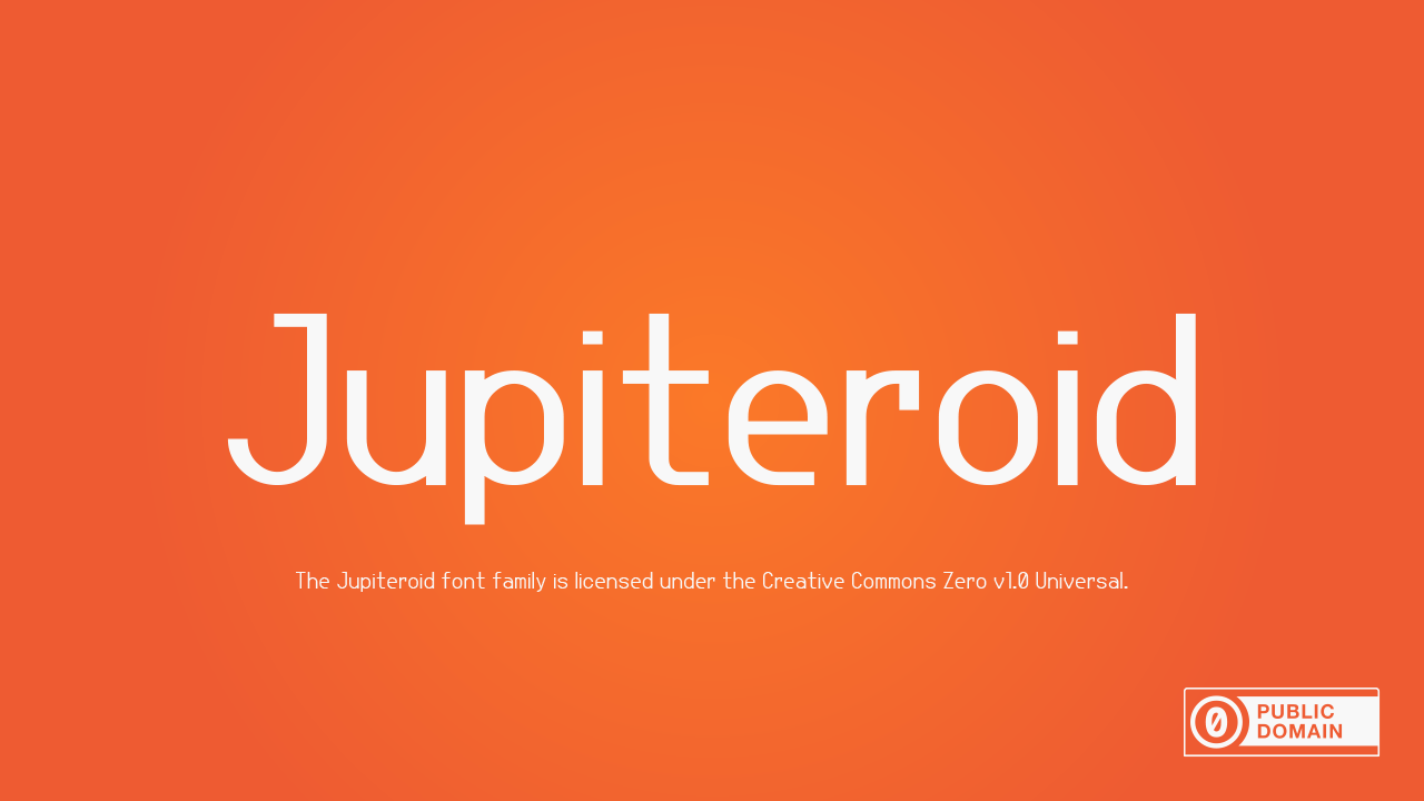 Шрифт Jupiteroid. Гарнитура содержит 6 файлов и поддерживает 64 языка. Лицензия CC0 1.0. Можно использовать в коммерческой и не коммерческой деятельности. Разработка Jupiteroid велась GGBotNet.