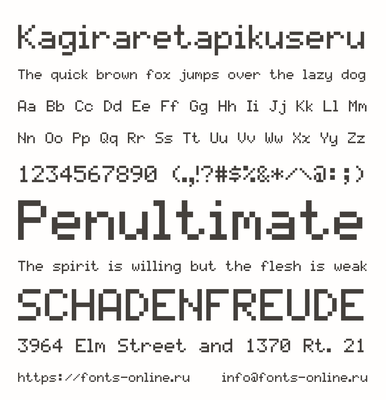 Шрифт Kagiraretapikuseru. Гарнитура содержит 1 файл и поддерживает 41 язык. Лицензия GNU GPL 3.0. Можно использовать в коммерческой и не коммерческой деятельности.
