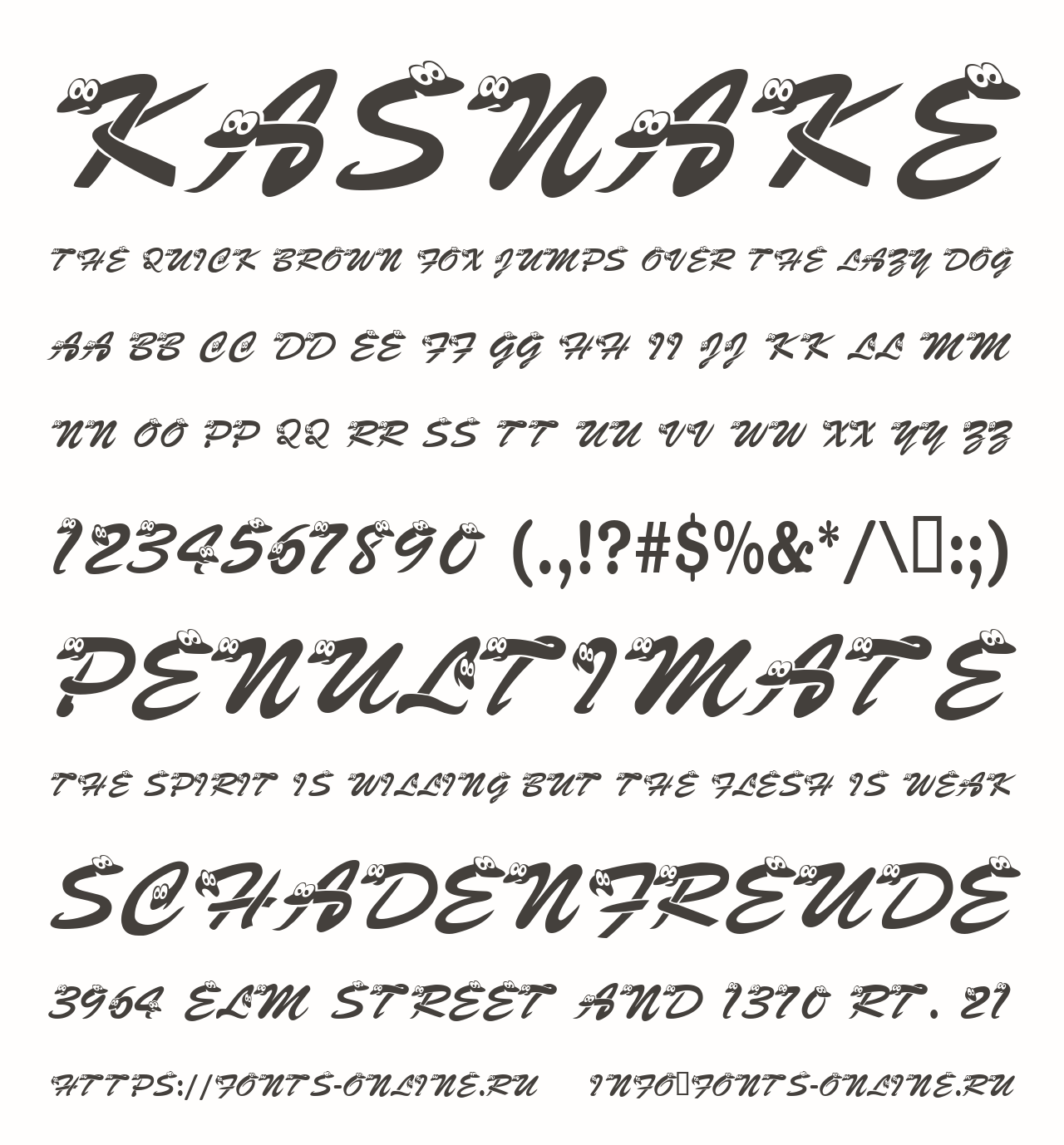 Шрифт KASnake. Гарнитура содержит 1 файл и поддерживает 12 языков. Можно использовать в коммерческой и не коммерческой деятельности.
