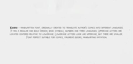Kosko PinterestFacebookTwitter Скачать Kosko Тестировать Kosko Сообщить об ошибке Шрифт Kosko. Гарнитура содержит 2 файла и поддерживает 16 языков. Изображения Дополнительная информация Категории Рукописные шрифты Маркер шрифты Скетч шрифты Школьные шрифты Шрифты кисти Комические шрифты Тематические шрифты Шрифты из мультфильмов Языки Английский Болгарский Зулу Индонезийский Корнский Оромо Руанда Рунди Русский Северный ндебеле Сомалийский Суахили Узбекский Украинский Чеченский Шона