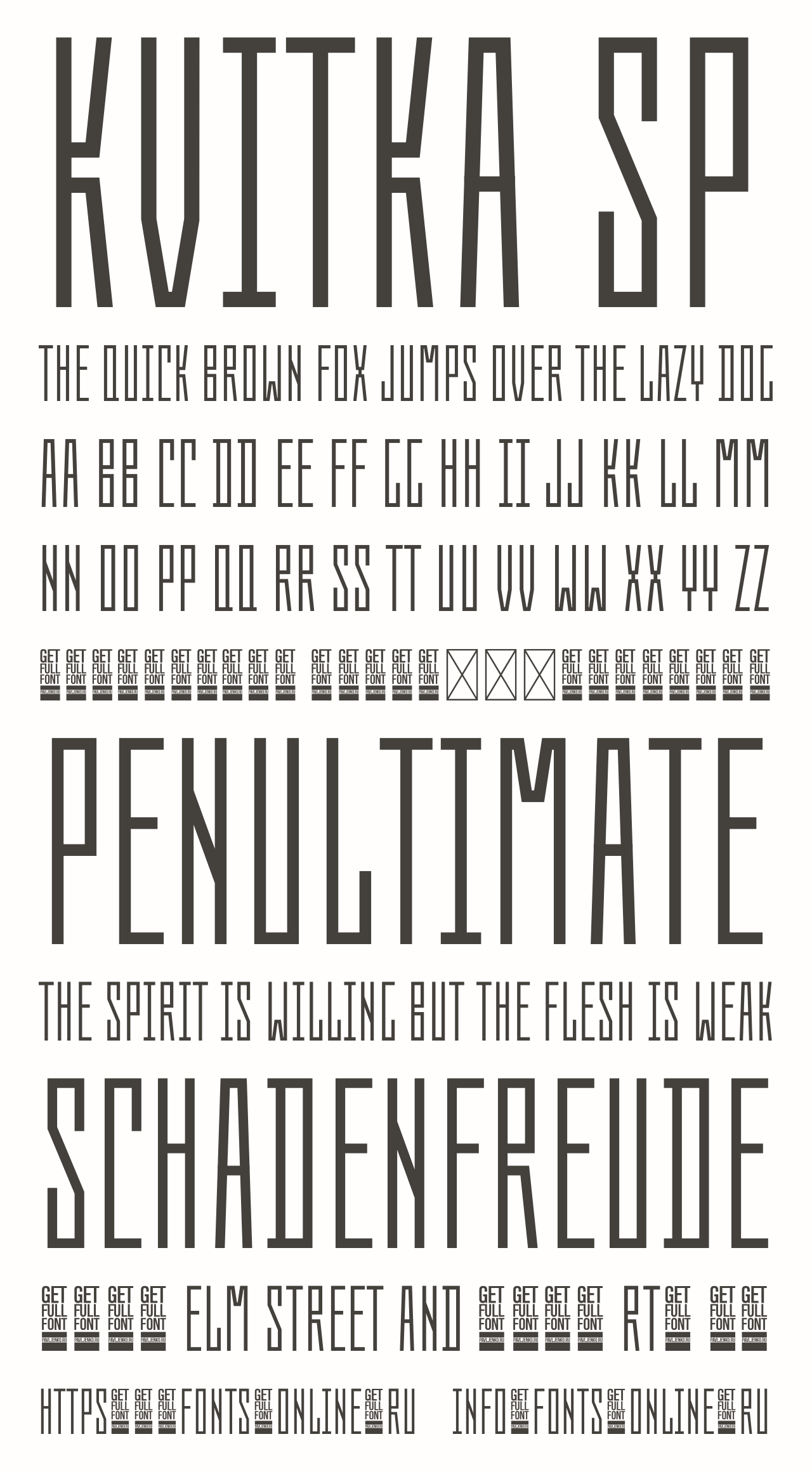 Kvitka SP — узкий, строгий, акцидентный шрифт с подчеркнутой вертикальностью и симметрией, напоминающей конструктивистские эксперименты начала XX века.