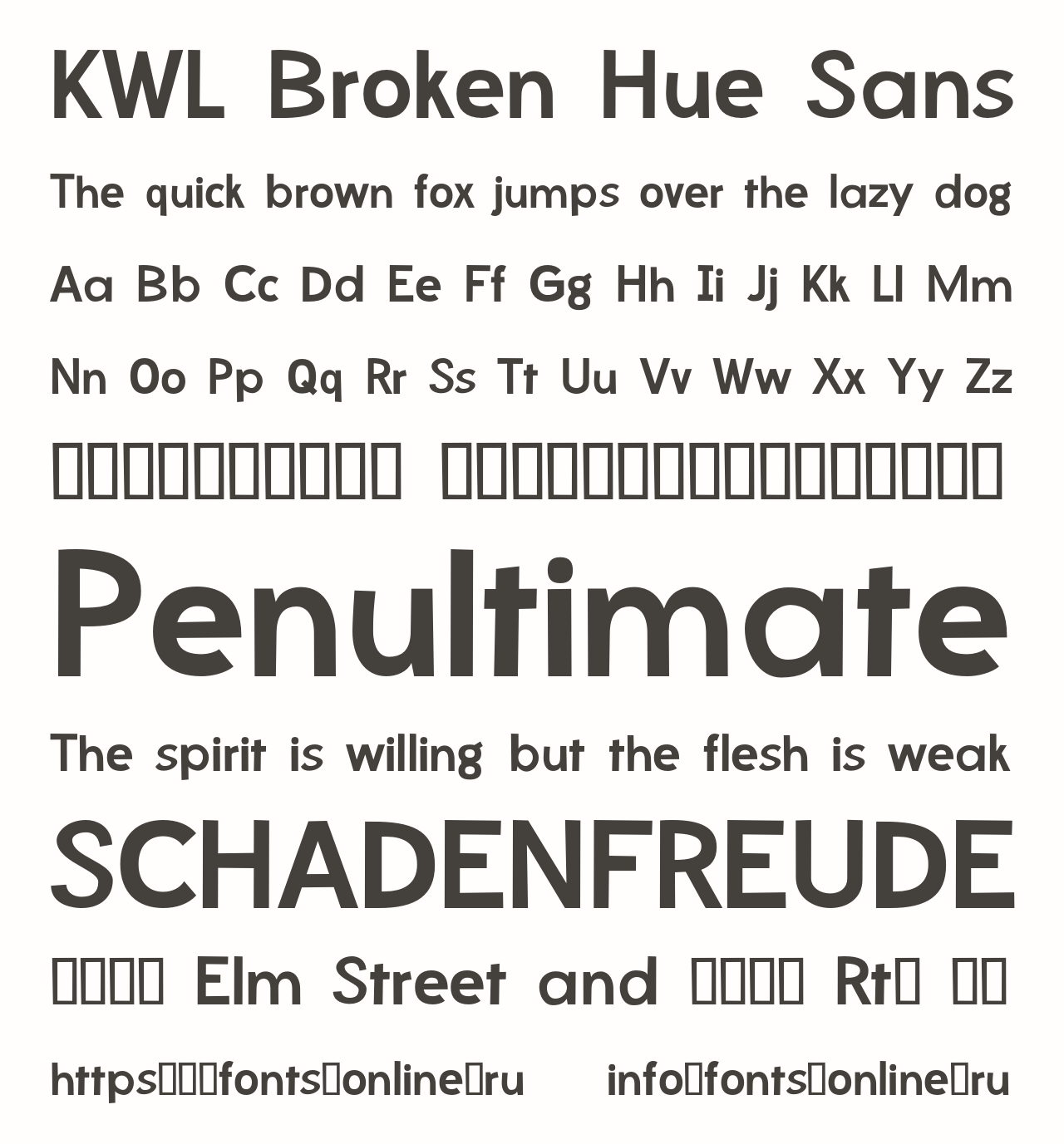 KWL Broken Hue Sans PinterestFacebookTwitter Скачать KWL Broken Hue Sans Тестировать KWL Broken Hue Sans Сообщить об ошибке Шрифт KWL Broken Hue Sans. Гарнитура содержит 1 файл и поддерживает 12 языков. Дополнительная информация Категории Шрифты без засечек Шрифты для заголовков Языки Английский Зулу Индонезийский Корнский Оромо Руанда Рунди Северный ндебеле Сомалийский Суахили Узбекский Шона