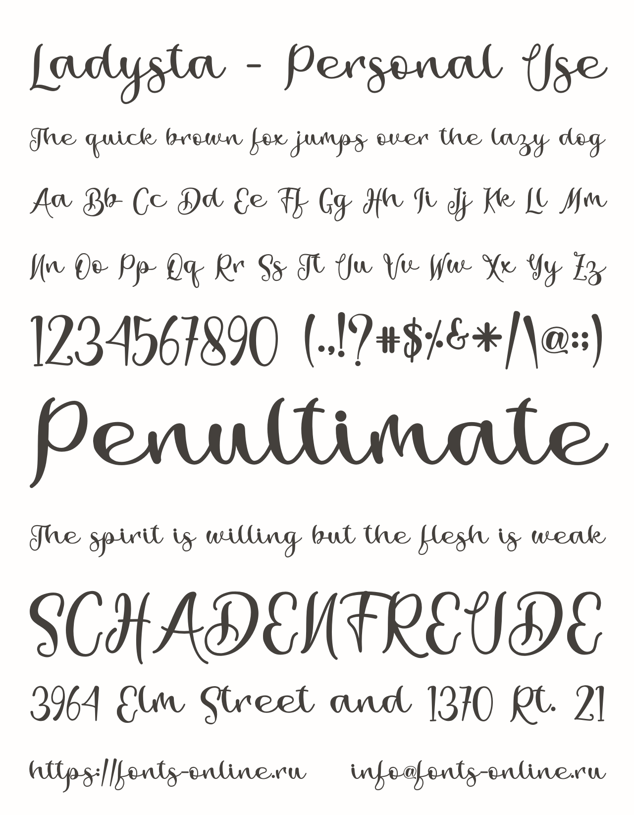 Шрифт Ladysta - Personal Use. Гарнитура содержит 1 файл и поддерживает 12 языков. Можно использовать в не коммерческой деятельности. Разработка Ladysta - Personal Use велась Letterafa Studio.