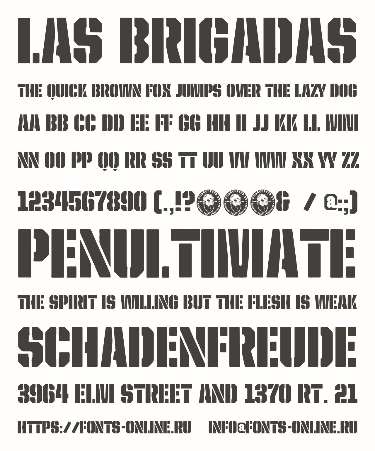 Шрифт Las Brigadas. Гарнитура содержит 1 файл и поддерживает 37 языков. Можно использовать в не коммерческой деятельности. Разработка Las Brigadas велась Woodcutter.