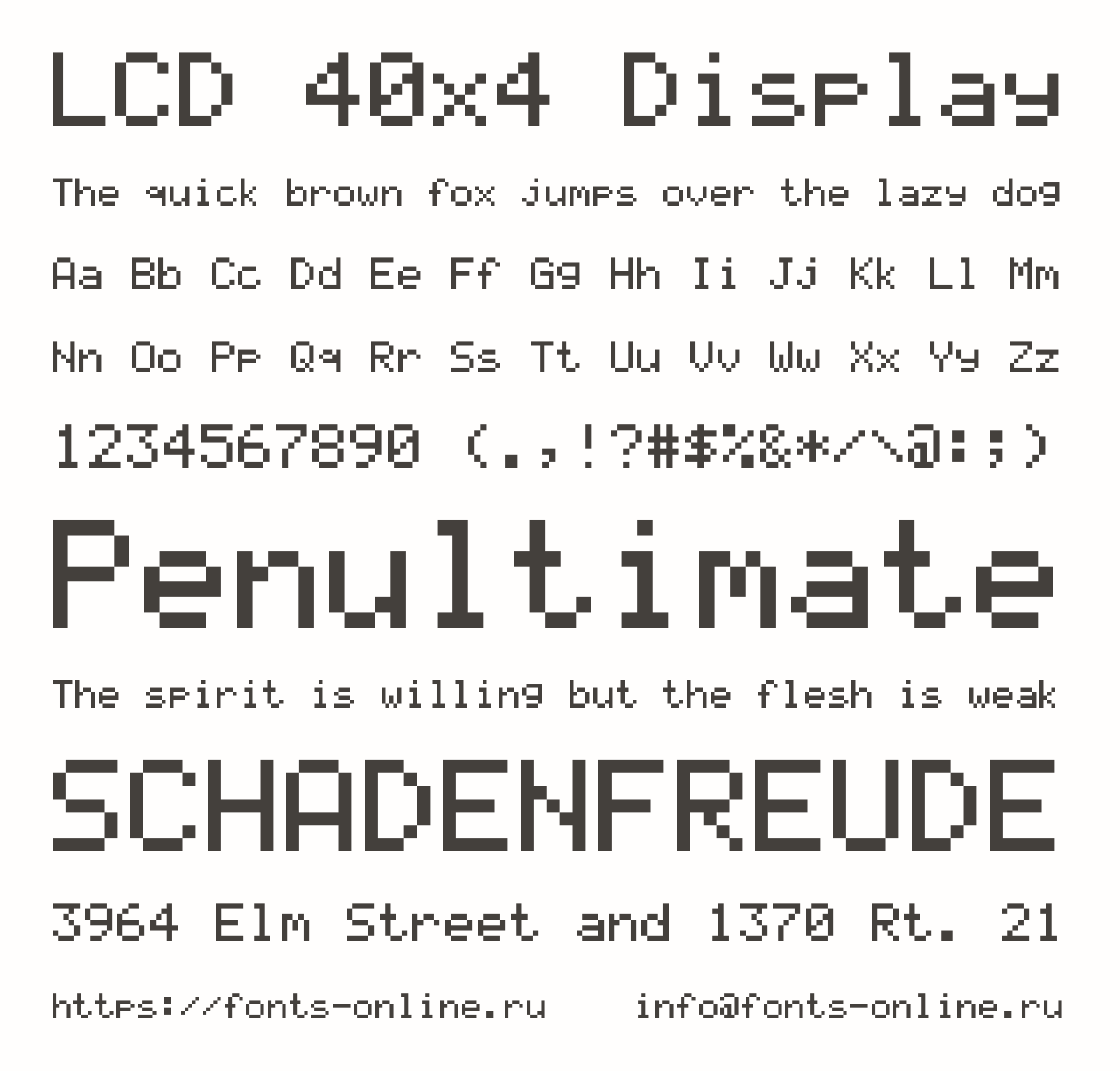 Шрифт LCD 40x4 Display. Гарнитура содержит 1 файл и поддерживает 51 язык. Лицензия GNU GPL 3.0. Можно использовать в коммерческой и не коммерческой деятельности.