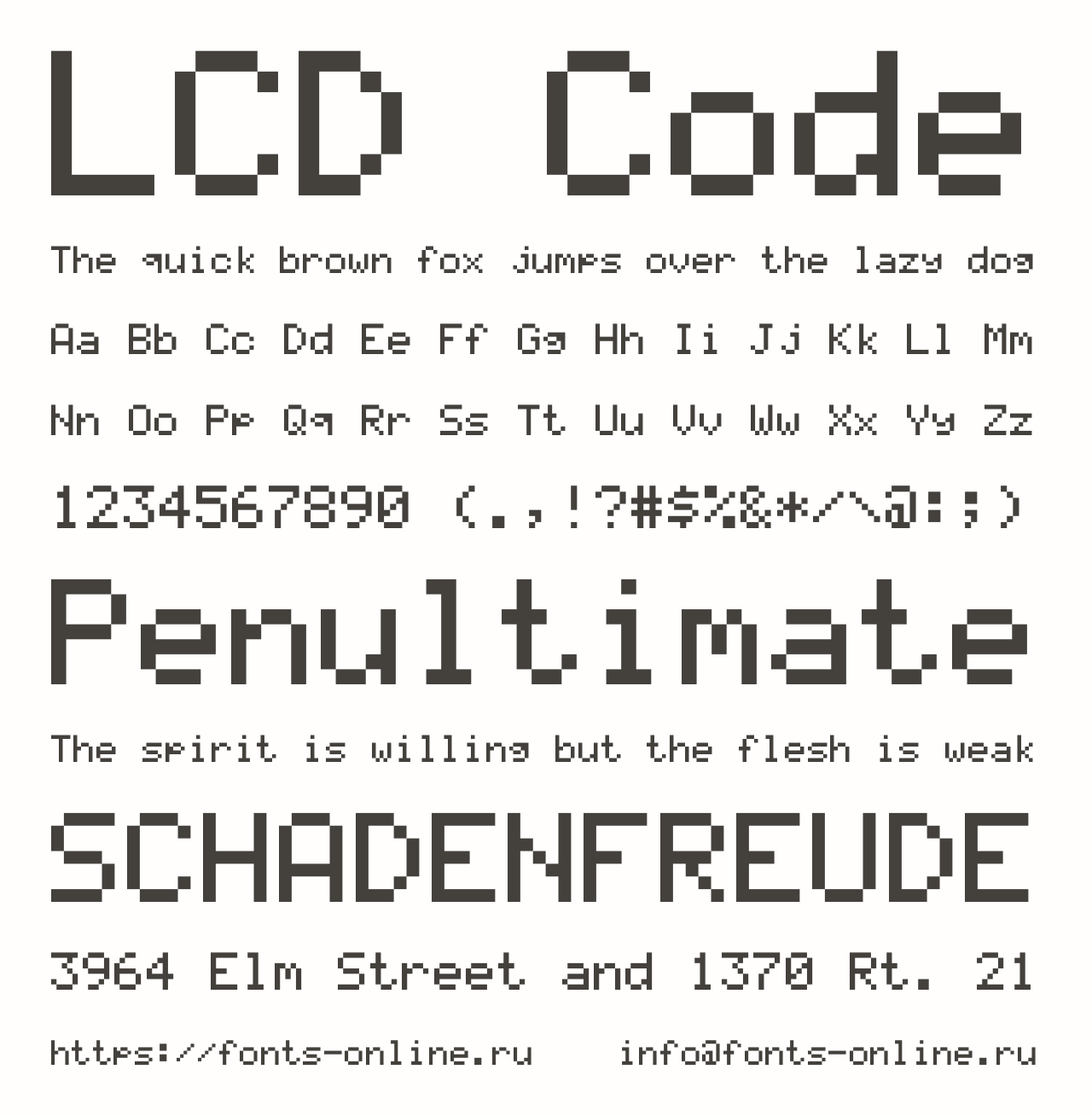 Шрифт LCD Code. Гарнитура содержит 1 файл и поддерживает 49 языков. Лицензия GNU LGPL 3.0. Можно использовать в коммерческой и не коммерческой деятельности.