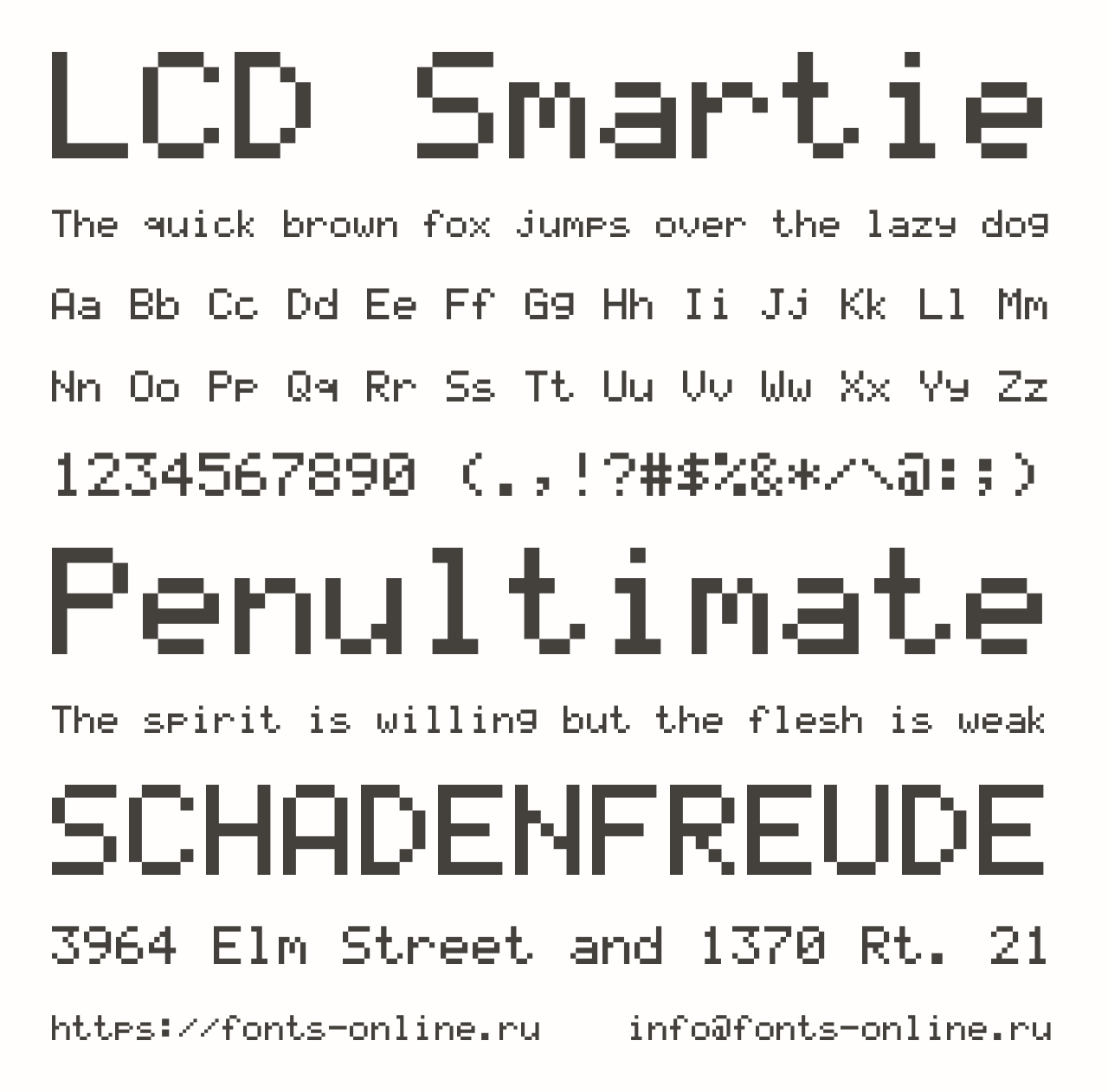 Шрифт LCD Smartie. Гарнитура содержит 1 файл и поддерживает 48 языков. Лицензия GNU GPL 3.0. Можно использовать в коммерческой и не коммерческой деятельности.