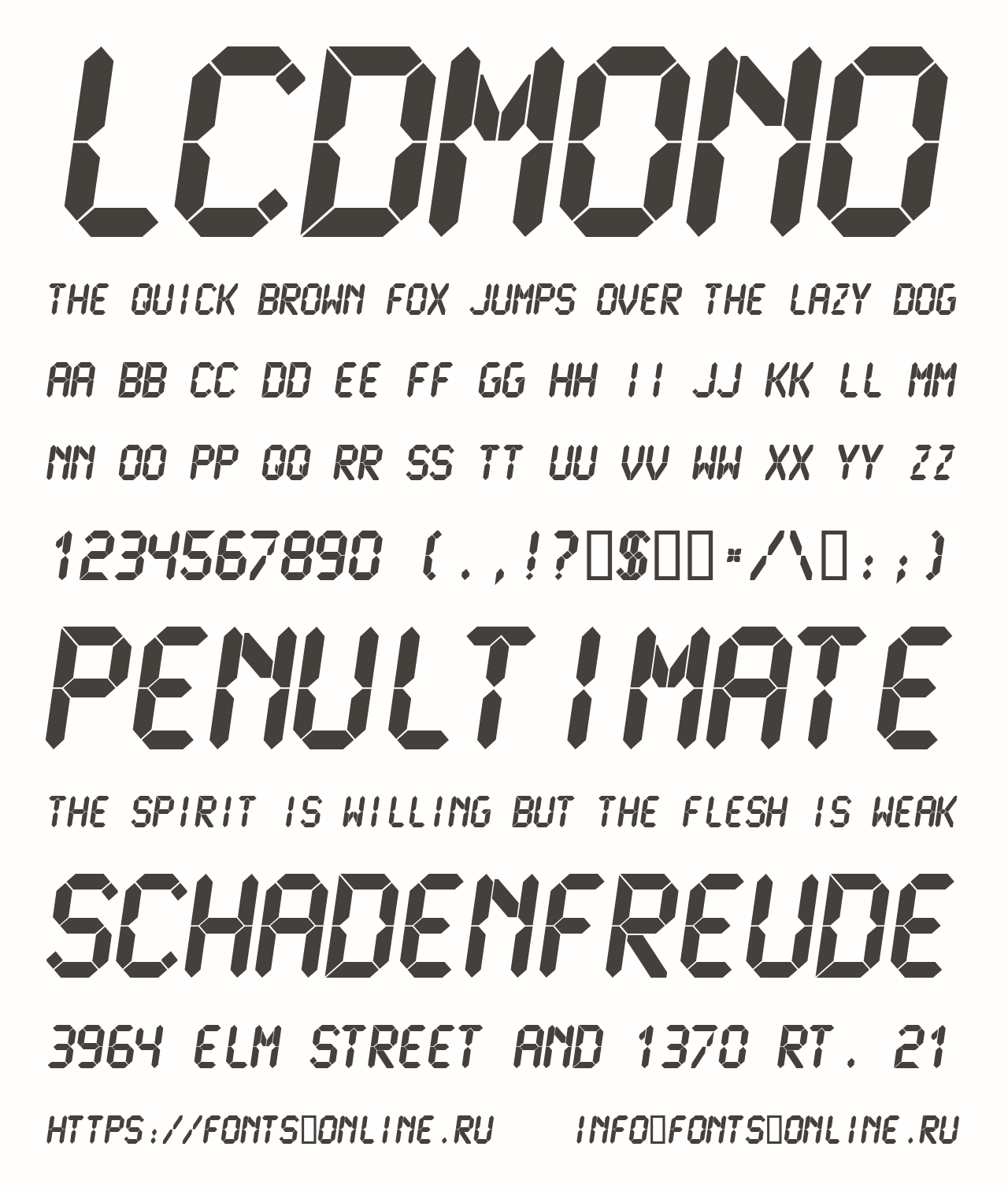 Шрифт LCDMono. Гарнитура содержит 16 файлов и поддерживает 12 языков. Разработка LCDMono велась Samuel Reynolds.