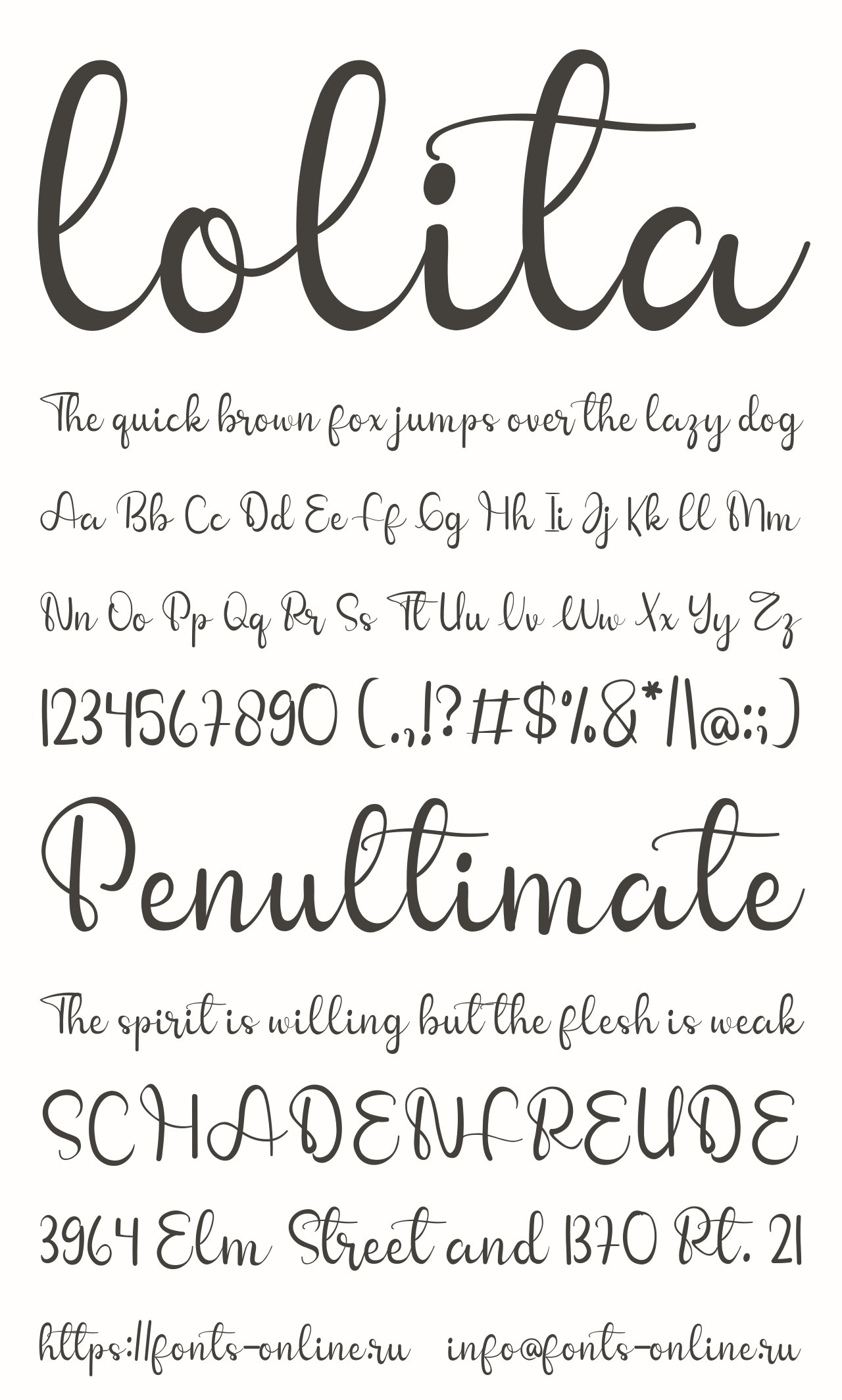 lolita PinterestFacebookTwitter Скачать lolita Тестировать lolita Сообщить об ошибке Шрифт lolita. Гарнитура содержит 1 файл и поддерживает 12 языков. Copyright lolita © Letterday Studio. 2022. All Rights Reserved Дополнительная информация Категории Винтажные шрифты Декоративные шрифты Дизайнерские шрифты Красивые шрифты Художественные шрифты Шрифты с завитушками Рукописные шрифты Каллиграфические шрифты Языки Английский Зулу Индонезийский Корнский Оромо Руанда Рунди Северный ндебеле Сомалийский Суахили Узбекский Шона