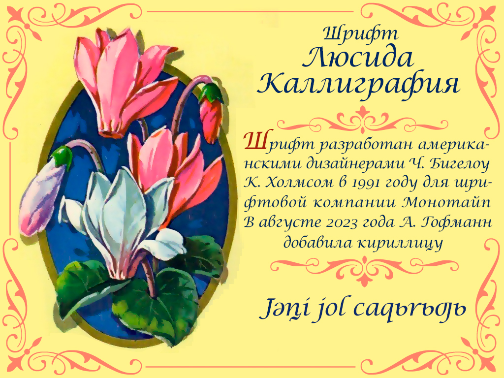 Шрифт Lucida CalligraphyС. Гарнитура содержит 1 файл и поддерживает 47 языков. Можно использовать в не коммерческой деятельности. Разработка Lucida CalligraphyС велась Alexandra Gophmann.