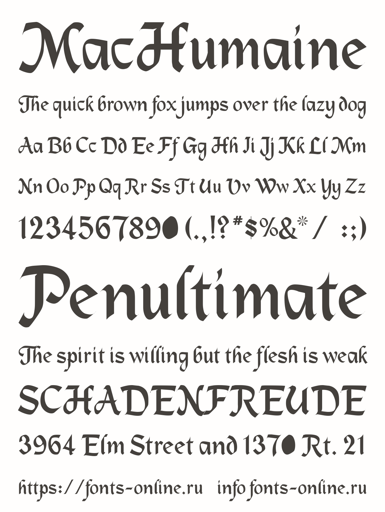Шрифт MacHumaine. Гарнитура содержит 1 файл и поддерживает 12 языков. Можно использовать в коммерческой и не коммерческой деятельности.