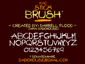 Шрифт Mad Stick Brush. Гарнитура содержит 1 файл и поддерживает 0 языков. Разработка Mad Stick Brush велась Darrell Flood.