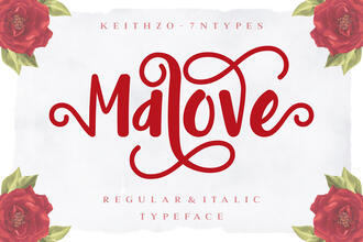 Шрифт Malove. Гарнитура содержит 2 файла и поддерживает 12 языков. Можно использовать в не коммерческой деятельности. Разработка Malove велась 7NTypes.
