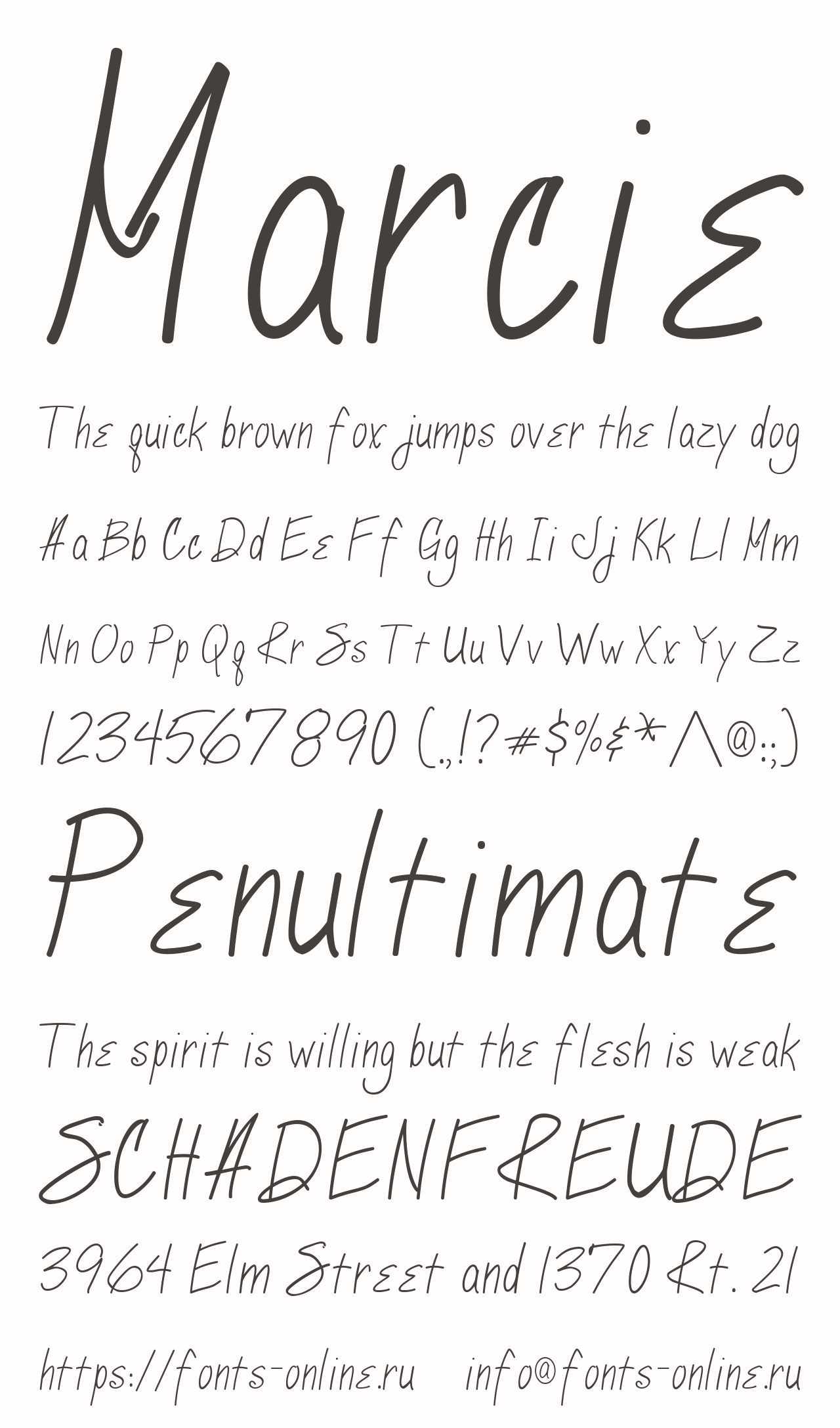 Шрифт Marcie. Гарнитура содержит 2 файла и поддерживает 12 языков. Можно использовать в коммерческой и не коммерческой деятельности.