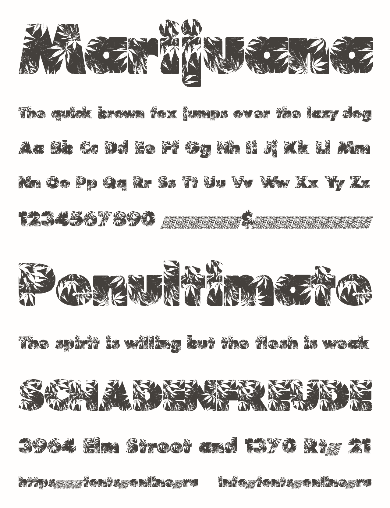 Шрифт Marijuana. Гарнитура содержит 1 файл и поддерживает 12 языков. Разработка Marijuana велась Xerographer Fonts.