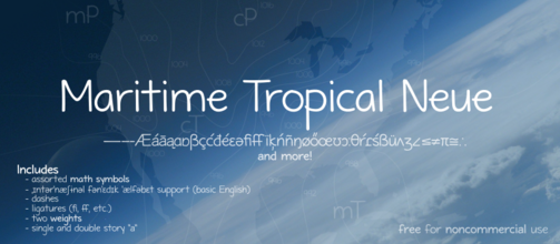 Шрифт Maritime Tropical Neue Double. Гарнитура содержит 4 файла и поддерживает 56 языков. Можно использовать в не коммерческой деятельности. Разработка Maritime Tropical Neue Double велась Kelvin Ma.