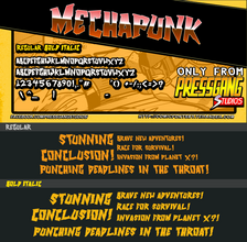 Шрифт Mechapunk. Гарнитура содержит 2 файла и поддерживает 37 языков. Можно использовать в не коммерческой деятельности. Разработка Mechapunk велась PressGang Studios.