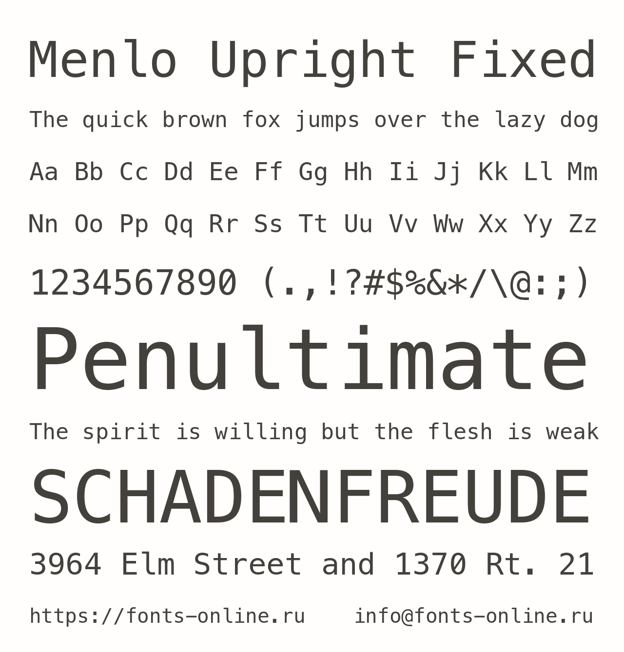 Шрифт Menlo Upright Fixed. Гарнитура содержит 2 файла и поддерживает 78 языков. Разработка Menlo Upright Fixed велась Jim Lyles.