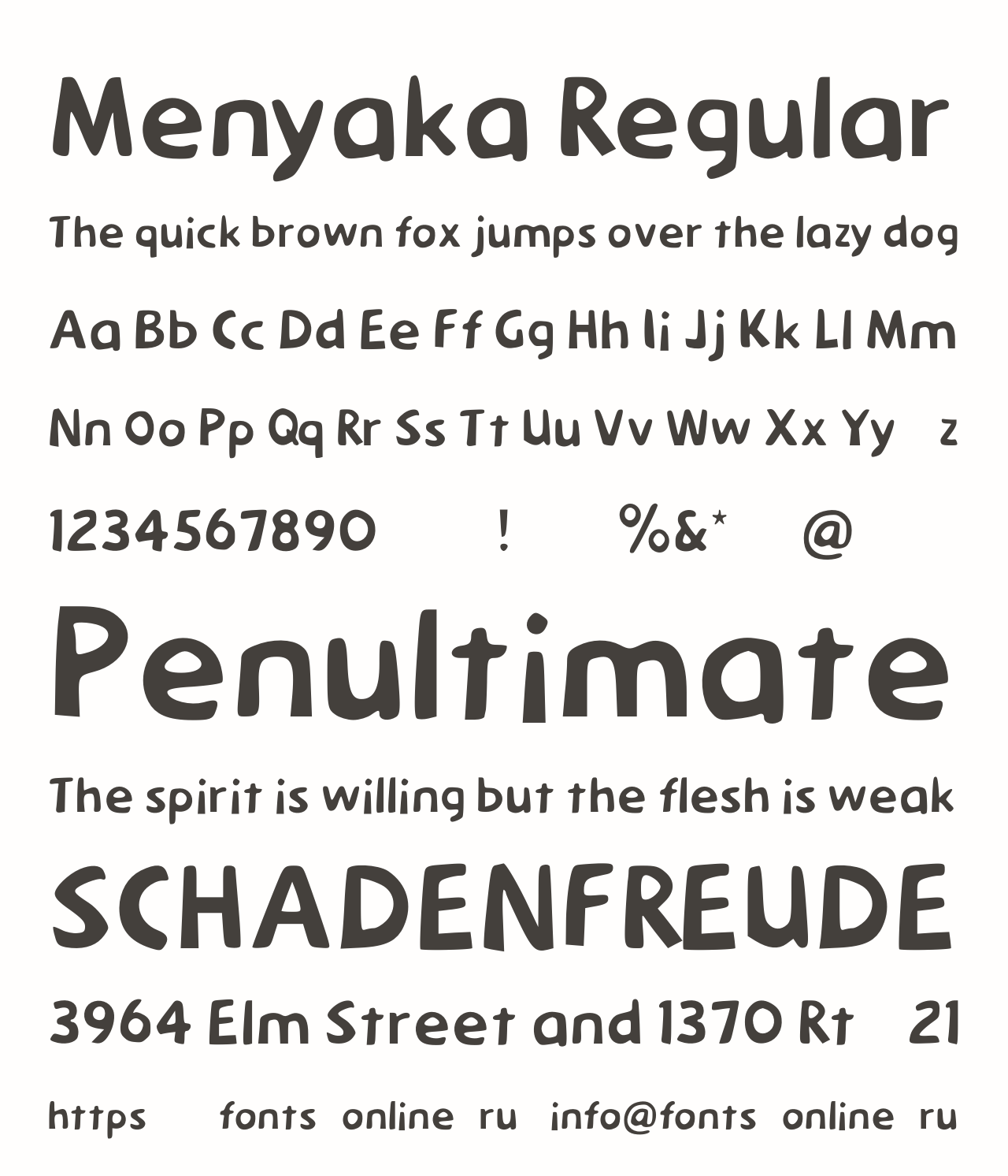 Menyaka Regular PinterestFacebookTwitter Скачать Menyaka Regular Тестировать Menyaka Regular Сообщить об ошибке Шрифт Menyaka Regular. Гарнитура содержит 1 файл и поддерживает 0 языков. Copyright Дополнительная информация Категории Комические шрифты Тематические шрифты