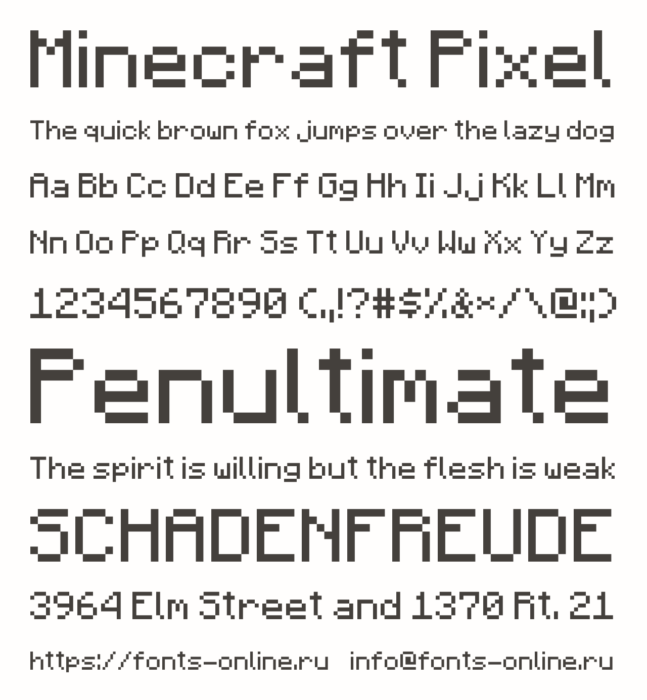Шрифт Minecraft Pixel. Гарнитура содержит 1 файл и поддерживает 12 языков. Лицензия CC BY-SA 3.0. Можно использовать в коммерческой и не коммерческой деятельности.
